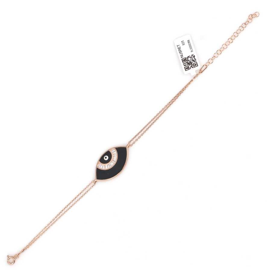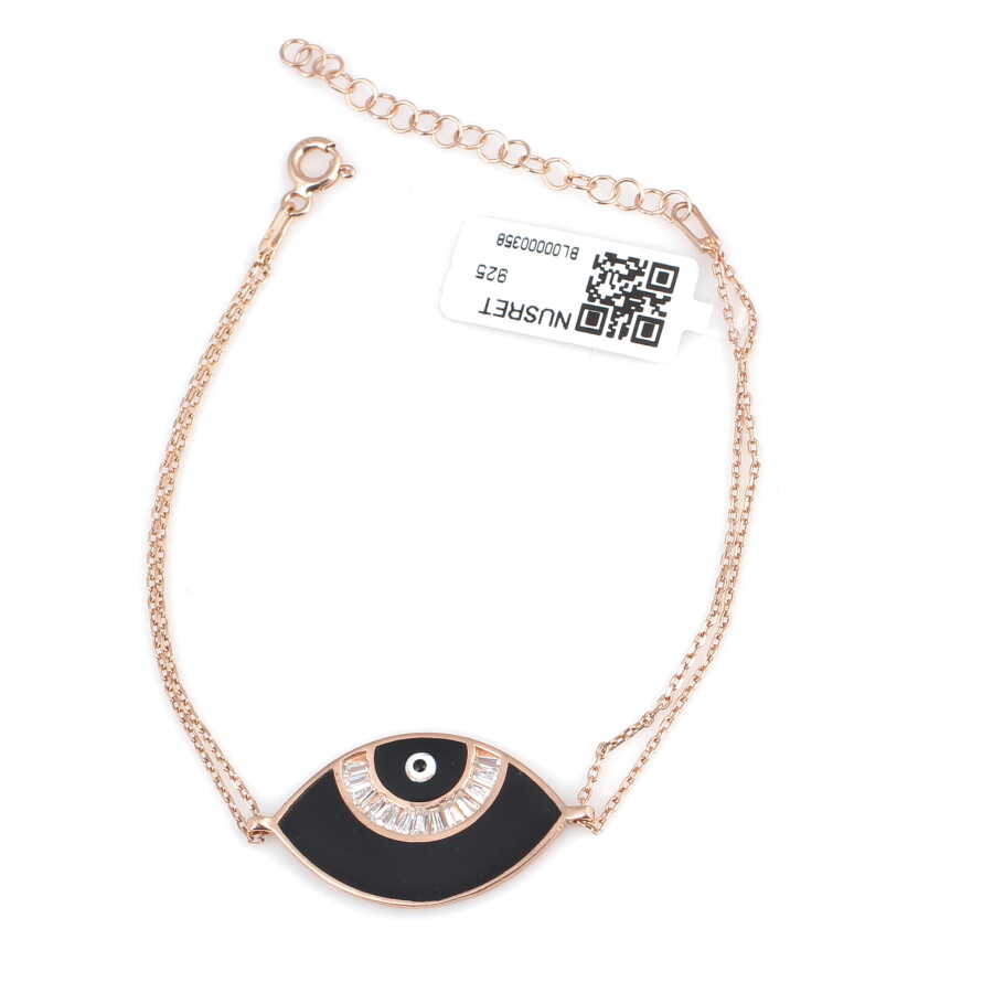 Bileklik 925 ayar gümüşten imal edilmiştir. Taşlı bileklik 20 cm uzunluğundadır. Göz (Nazar boncuğu) figürü mineli, çift zincirli ve zirkon taşlıdır. Gümüş bileklik 3,45 gram ağırlığındadır.