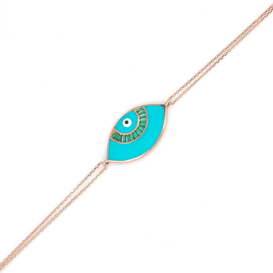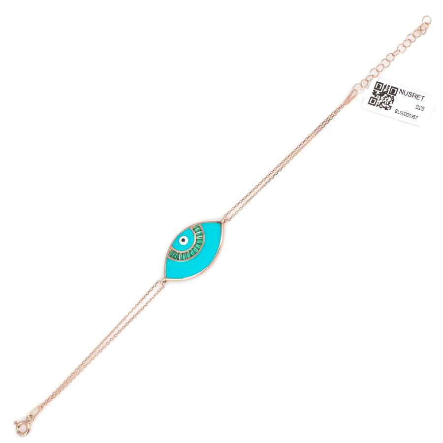 Bileklik 925 ayar gümüşten imal edilmiştir. Taşlı bileklik 18 cm uzunluğundadır. Göz (Nazar boncuğu) figürü mineli ve zirkon taşlıdır. Gümüş bileklik 3,44 gram ağırlığındadır.