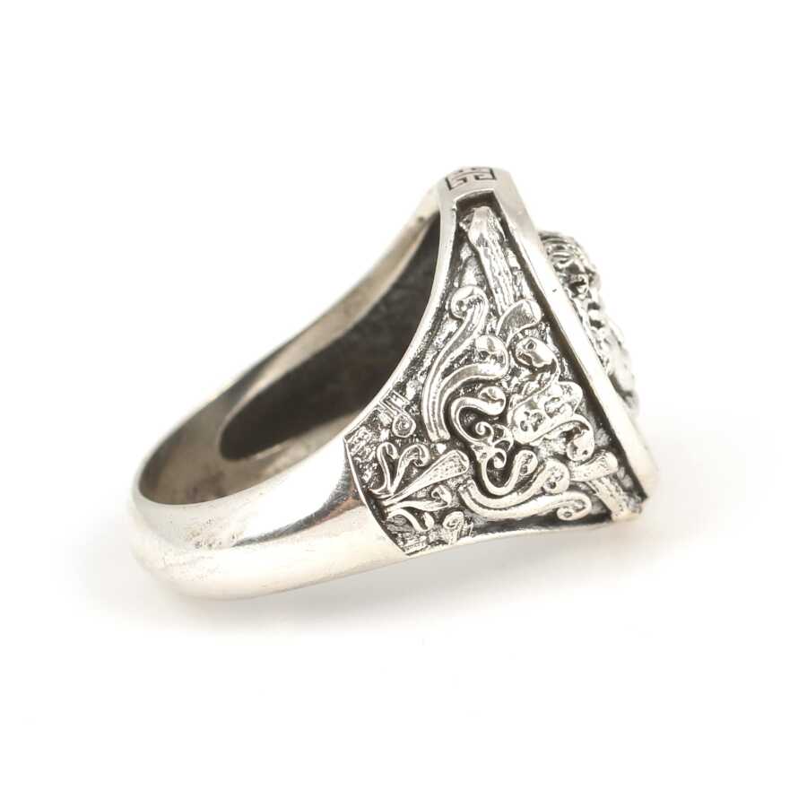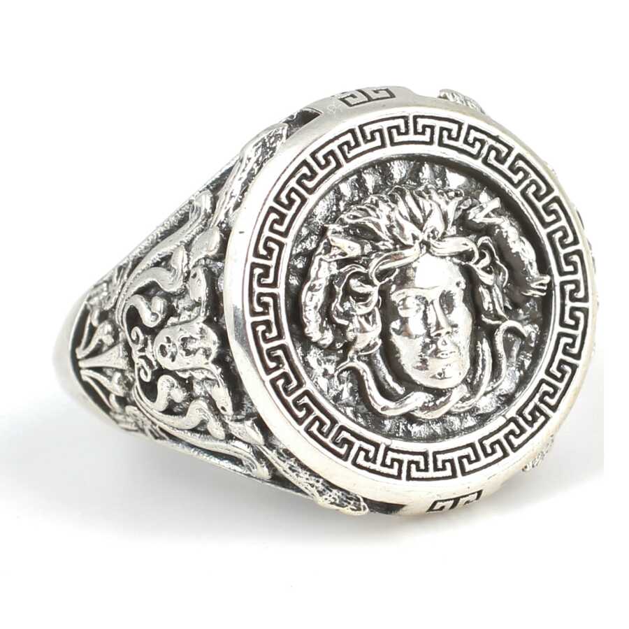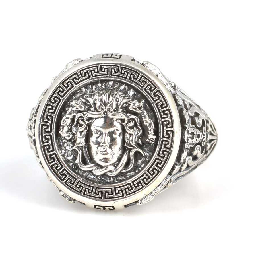 Gelince Haber Ver Gümüş yüzük 925 ayar gümüşten yapılmıştır. Gümüş yüzüğün üst kısmı 2 cm boyutlarındadır. Yüzük üzerinde kabartma şeklinde medusa figürü ve çevresinde grek desenleri vardır. Yüzük taşsızdır. Yüzük 23 ölçüdür. Tüm ölçüler yapılabilmektedir. Ağırlığı 14,12 gramdır.