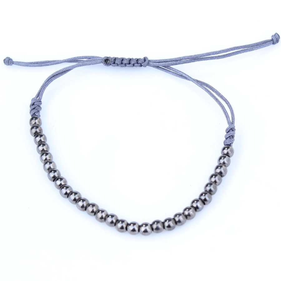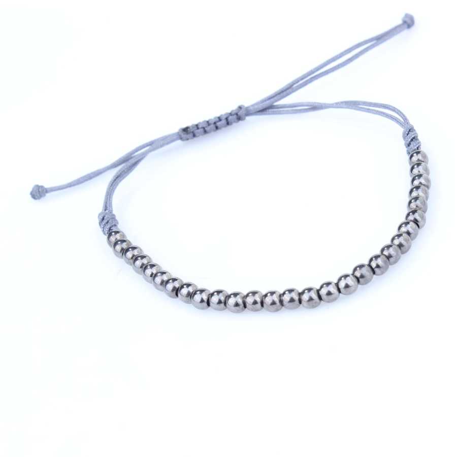 Bileklik 925 ayar gümüşten imal edilmiştir. 0,4 cm oksitli toplardan oluşan bileklik gri renk ipli ayarlanabilir ölçüdür. Gümüş bileklik 3,47 gram ağırlığındadır.