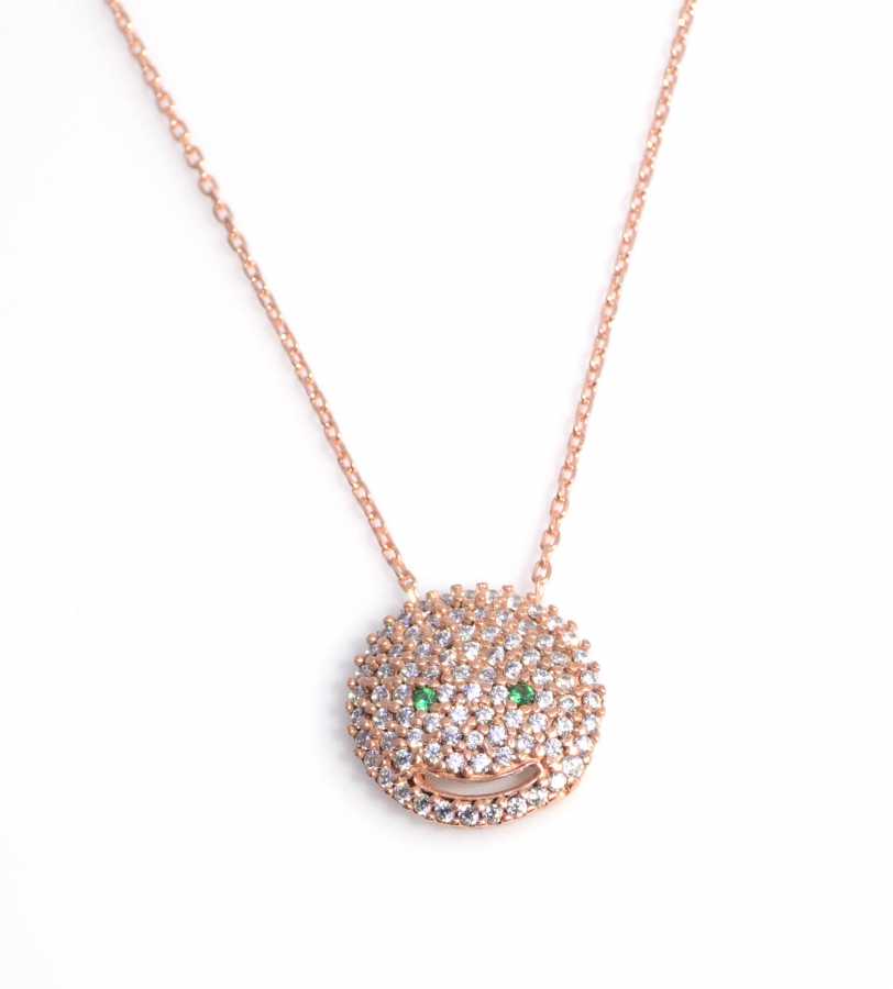Gümüş kolye 925 ayar gümüşten yapılmıştır. Gülen yüz kolye 1,4 cm boyutlarındadır. Zinciri 41 cm uzunluğundadır. Kolye zirkon taşlıdır. Ağırlığı 2,49 gramdır.