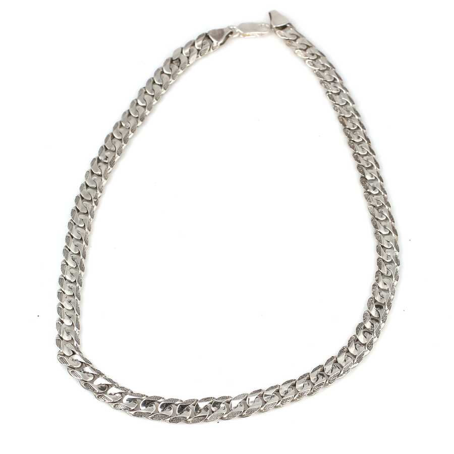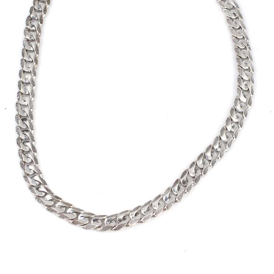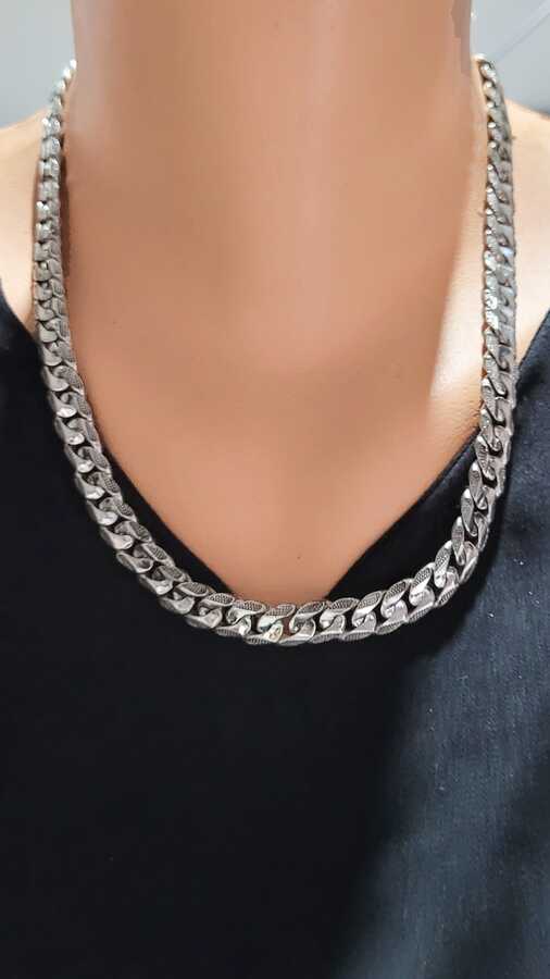 Gümüş kolye 925 ayar gümüşten yapılmıştır. Desenli gurmet zincir kolye 50 cm uzunluğundadır. Kolye 0,9 cm enindedir. Kolye taşsızdır. Ağırlığı 61 gramdır.