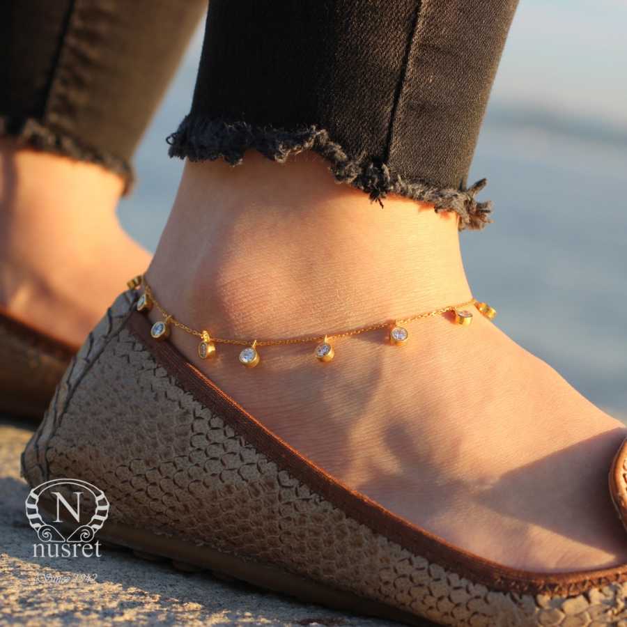 925 Ayar Gümüş 12 Taşlı Sarı Halhal Bileklik, Beyaz Taş