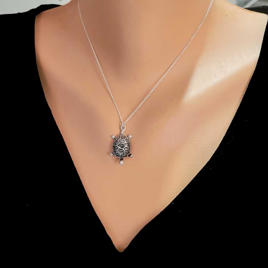 Gümüş kolye 925 ayar gümüşten yapılmıştır. Gümüş kolye 45 cm uzunluğundadır. Harita kaplumbağa şeklinde kolye 2,7 cm'ye 1,5 cm boyutlarındadır. Kolye taşsızdır. Charm Kolye 4,03 gramdır.
