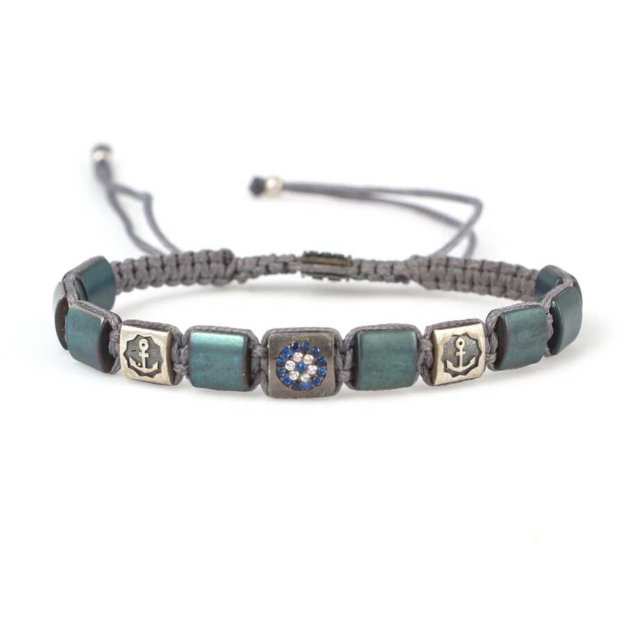 Bileklik 925 ayar gümüşten imal edilmiştir. Kare hematit taşlı ipli bileklik ayarlanabilir ölçüdür. Bileklik hematit taş aralarında gümüş nazar boncuk ve deniz çıpası deseni ile makrome örgü şeklinde tasarlanmıştır. Bileklik 0,7 cm kalınlığındadır. Gümüş bileklik 10,07 gram ağırlığındadır.