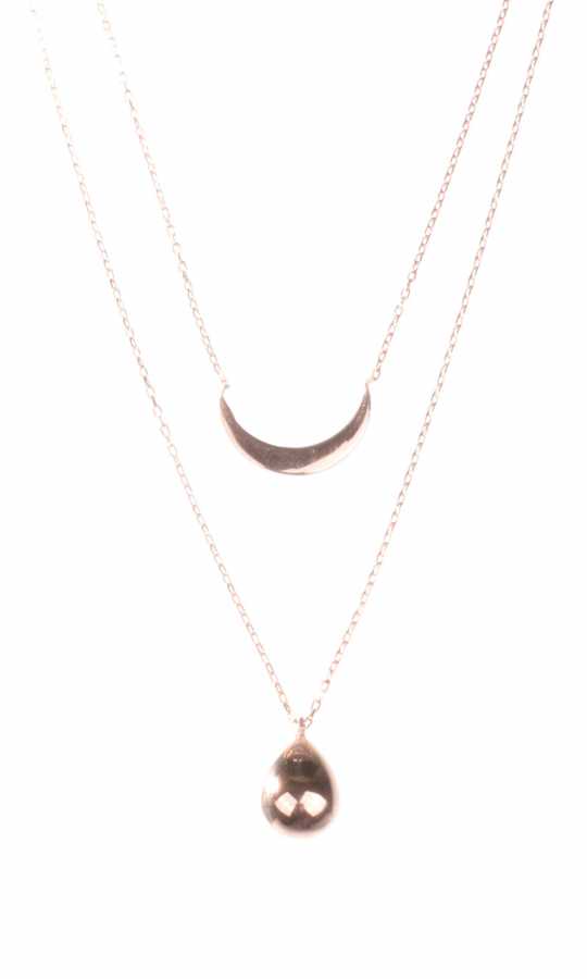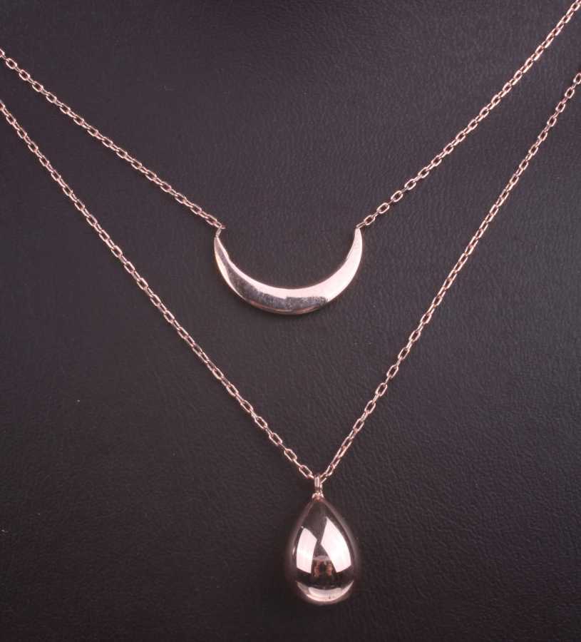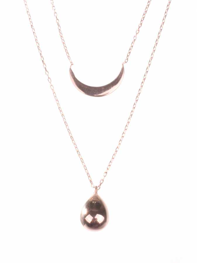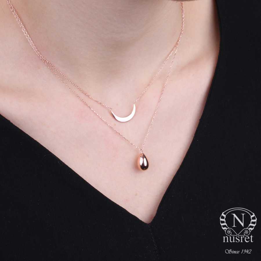 Gümüş kolye 925 ayar gümüşten yapılmıştır. Ay ve drop parçalarından oluşan 2 zincirli kolyenin damla şeklindeki parçası 1,5 cm'ye 1,0 cm ve hilal şeklindeki parçası 1,7 cm'ye 1,0 cm boyutlarındadır. Kısa zinciri 36 cm ve uzun zinciri 44 cm uzunluğundadır ve taşsızdır. Ağırlığı 3,3 gramdır.