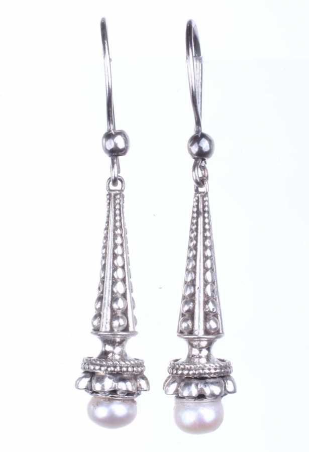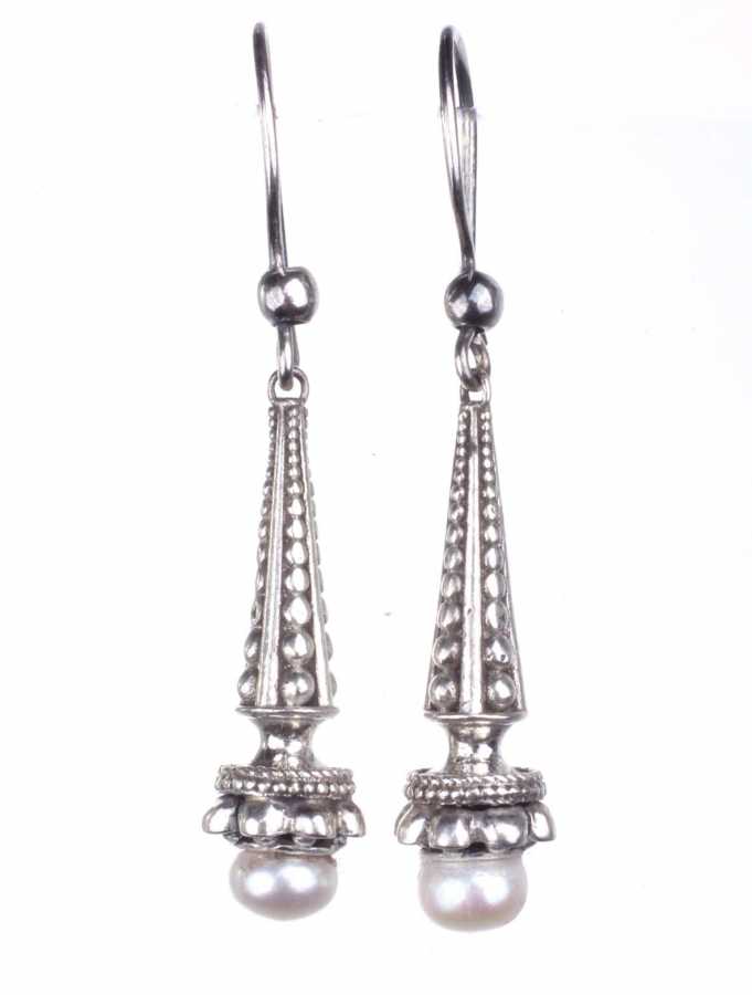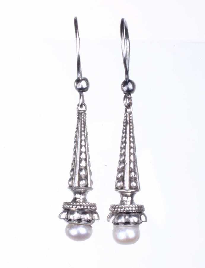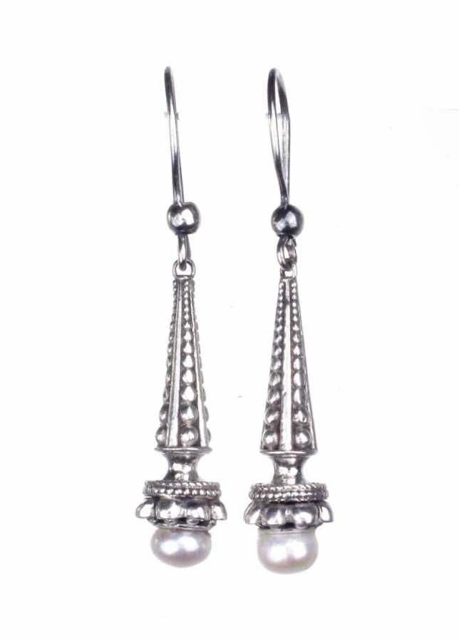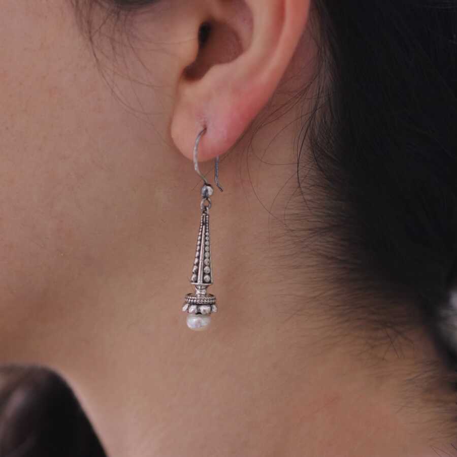 Gümüş küpe 925 ayar gümüşten yapılmıştır. Antik Bizans şeklindeki koni şeklindeki küpe inci taşlıdır. Ağırlığı 7,97 gramdır.
