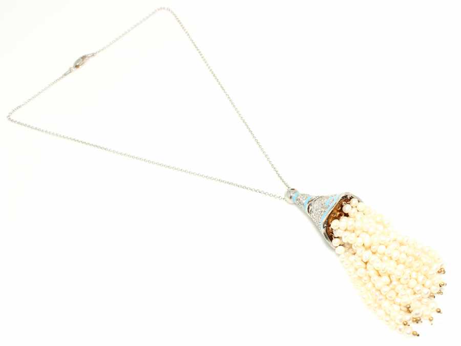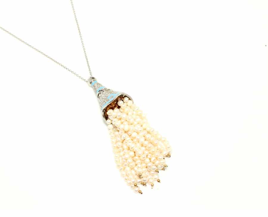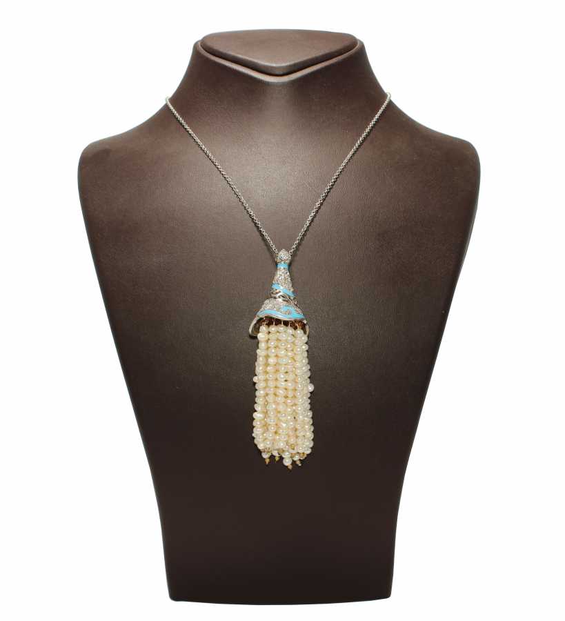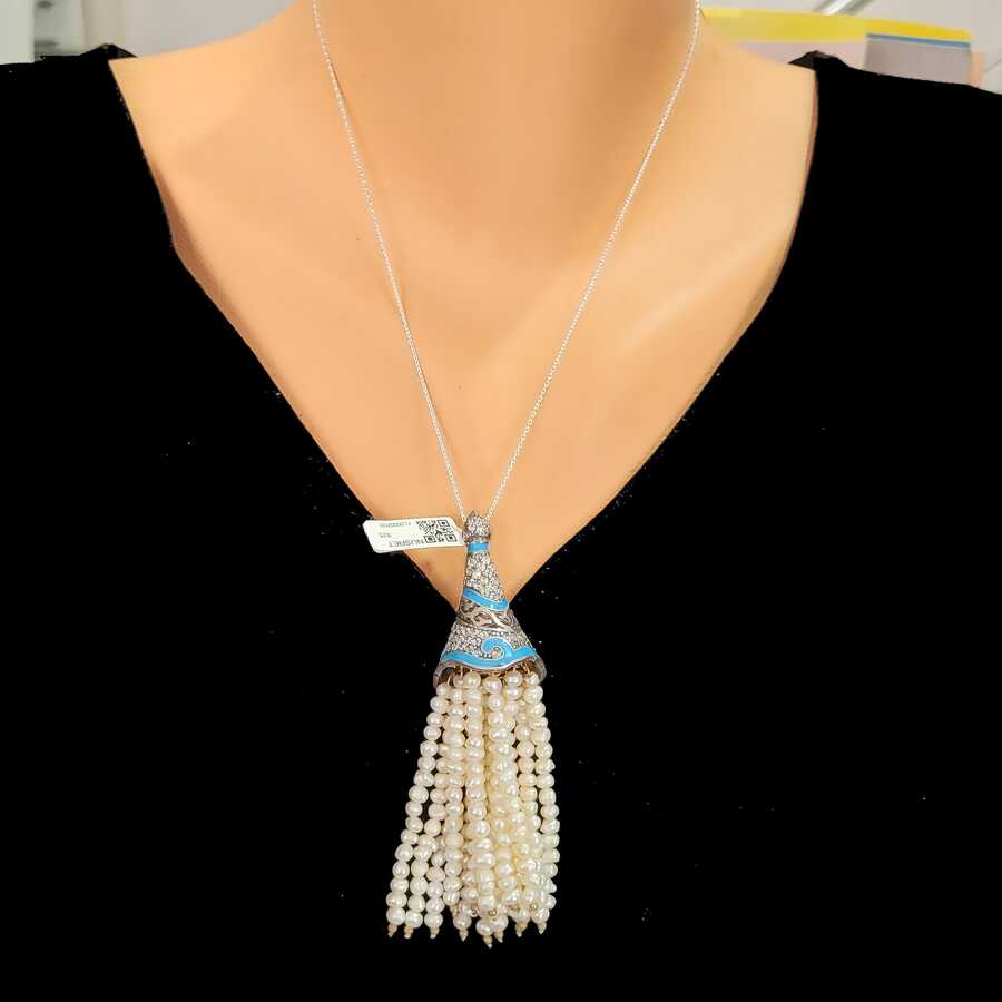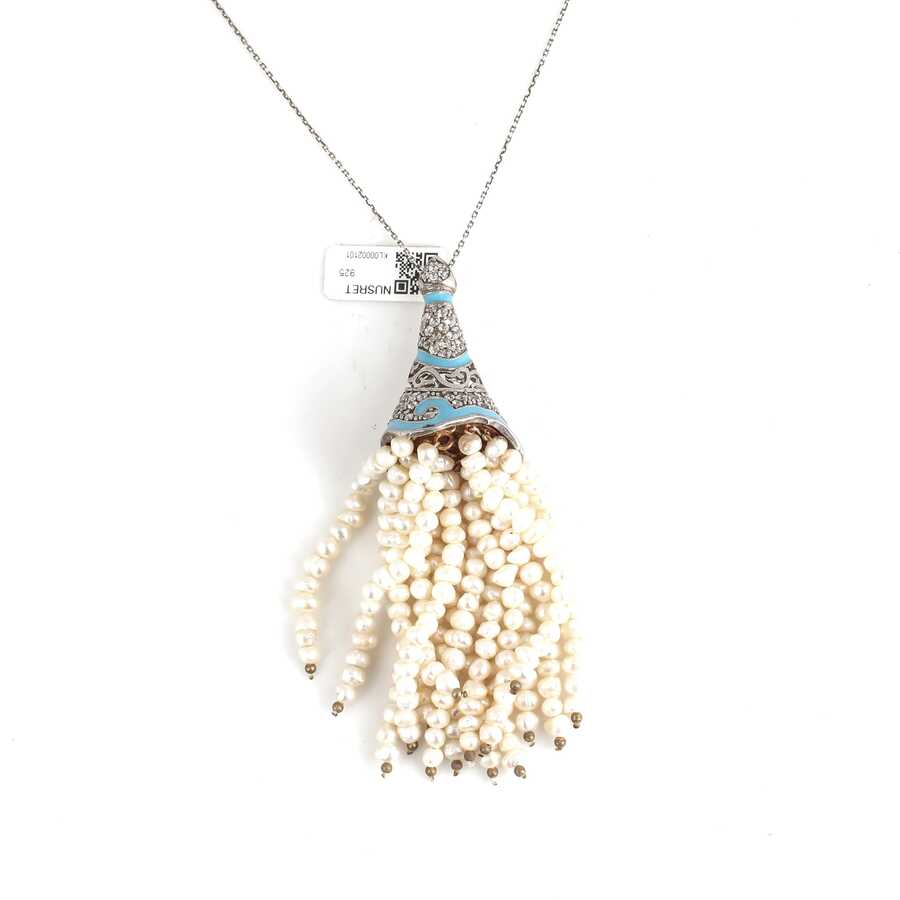 925 ayar gümüş inci taşlı kolye 45 cm uzunluğunda 9 cm püskül uzunluk Gramı: 38,51 gr
