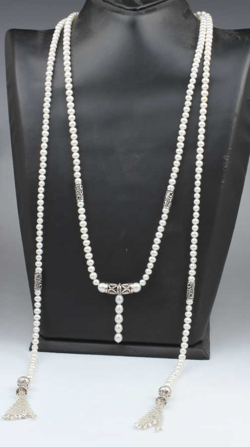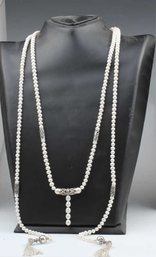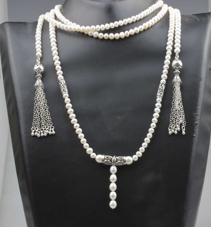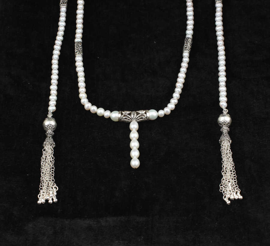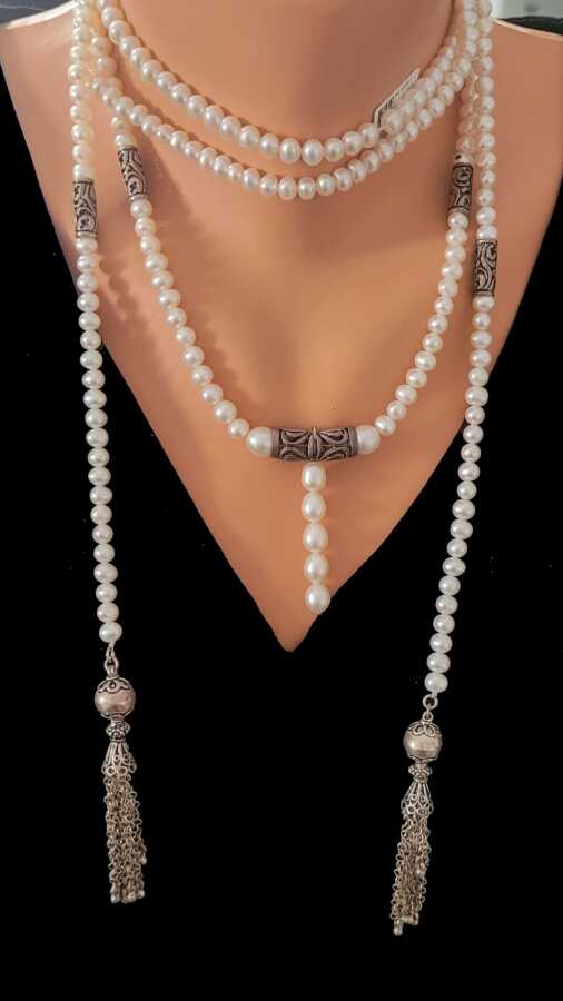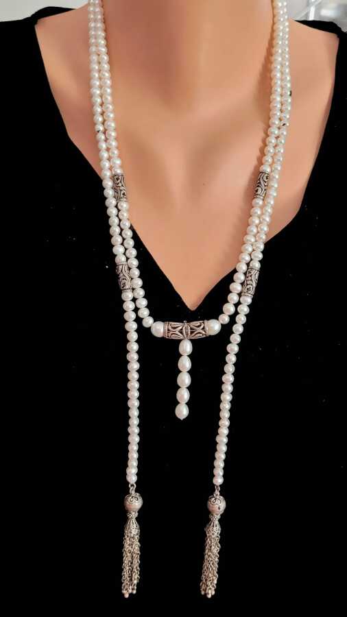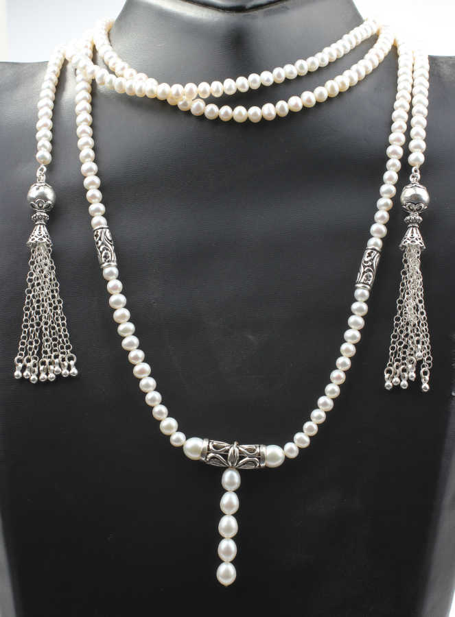 925 ayar gümüştür. 180 cm kolye uzunluğunda boyunun sağ ve sol kısımlarından akıtarak takılan incili taşlı fantezi kolyedir. Gramı: 115,4 gr