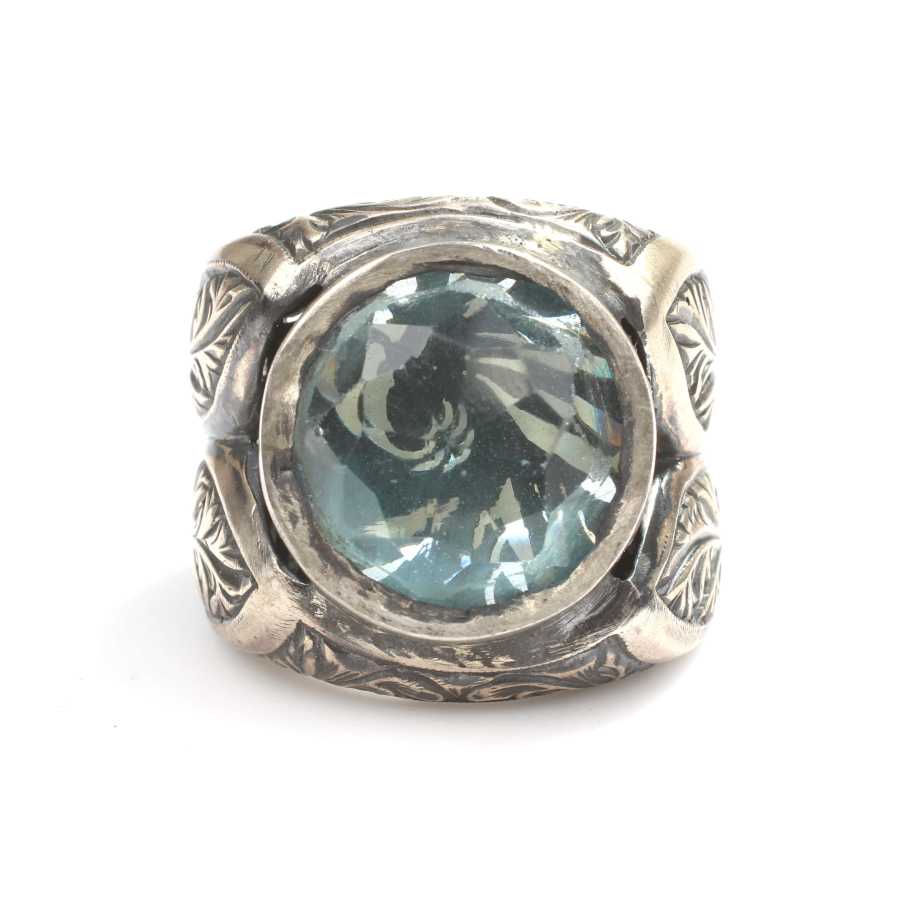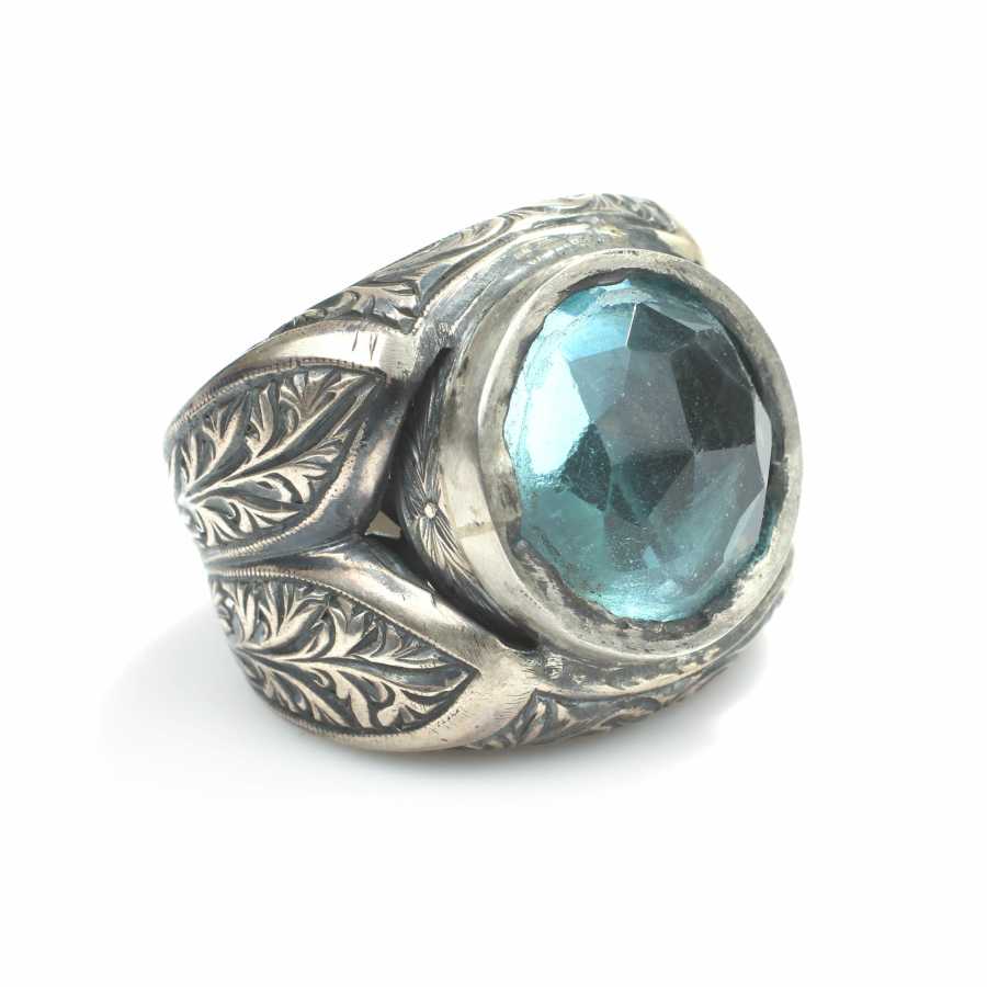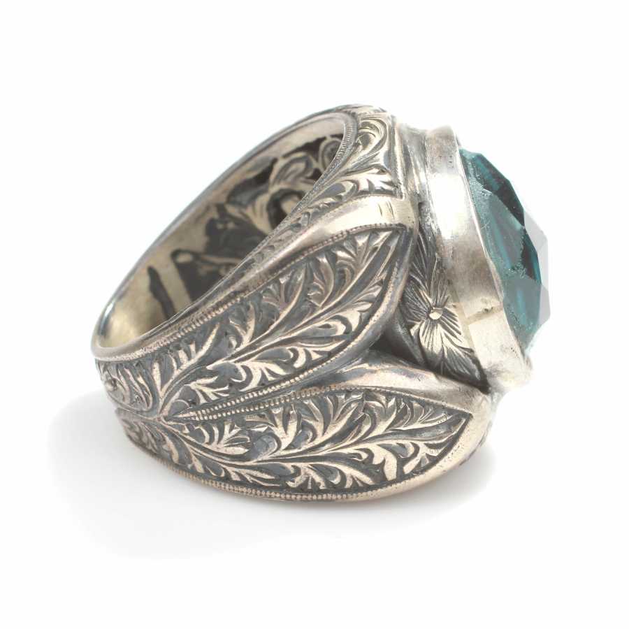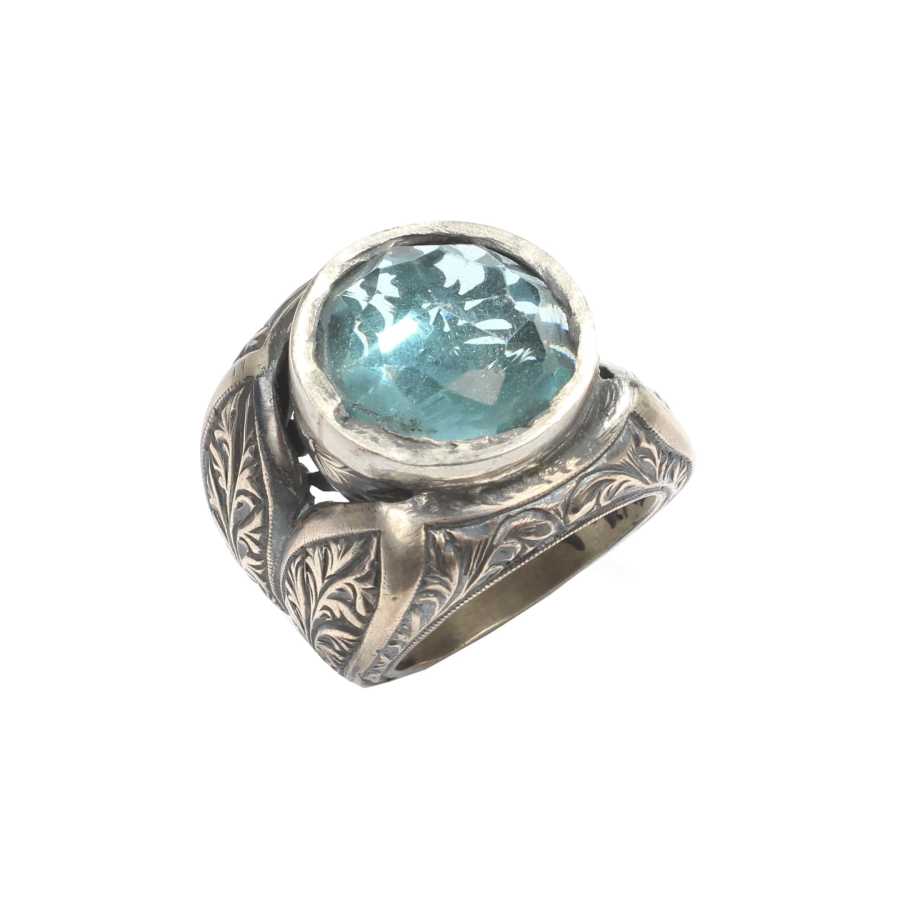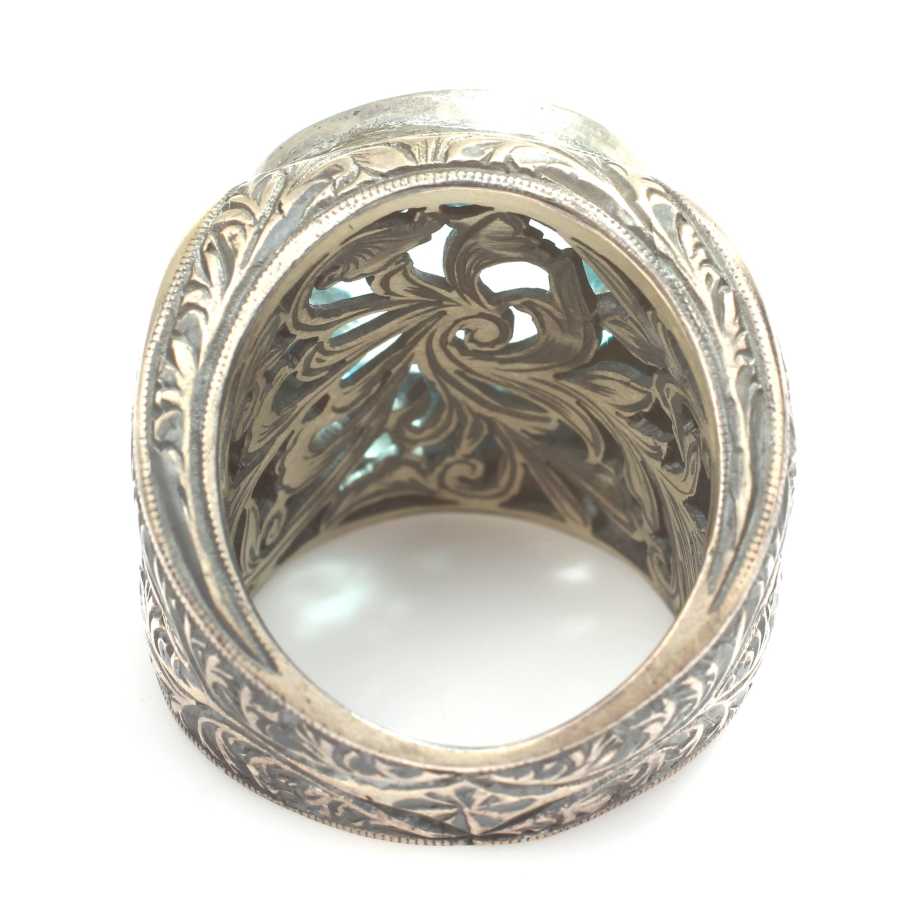 Yüzük 925 ayar gümüşten üretilmiştir Yüzüğün üzerinde el kalemi atılarak tasarlanmıştır. Resimdeki yüzük 18 ölçüdür, ancak tüm ölçüler özel olarak yapılabilmektedir. Yüzük akuamarin renk taşlıdır. Ağırlığı 34,43 gramdır.