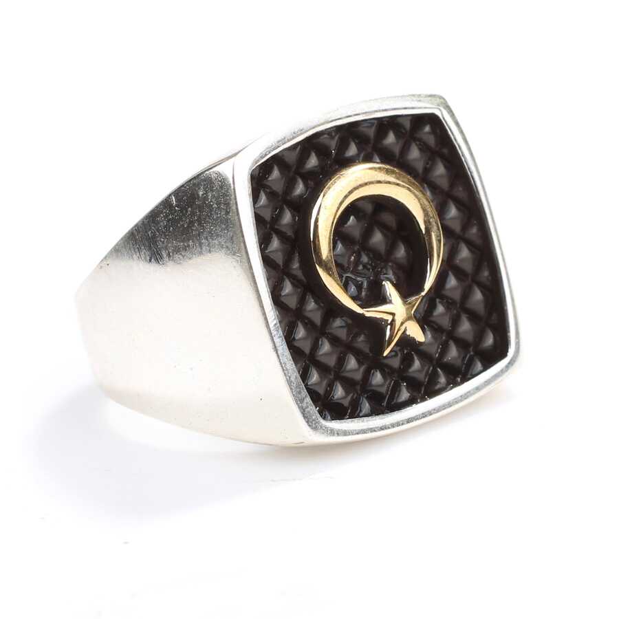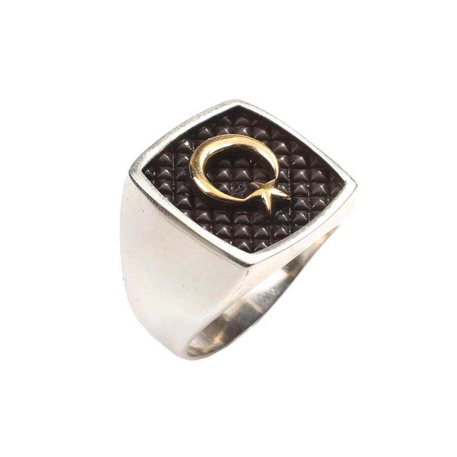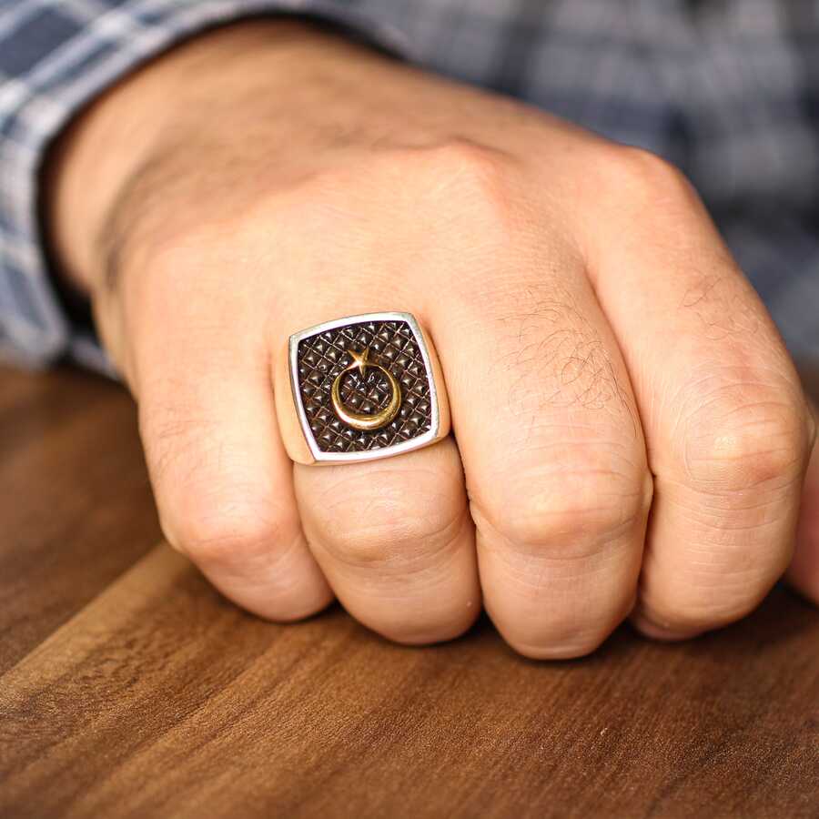 925 ayar gümüştür 23 ölçü 20 x 20 mm kare ay yıldız model erkek yüzük Gramı: 10,56 gr