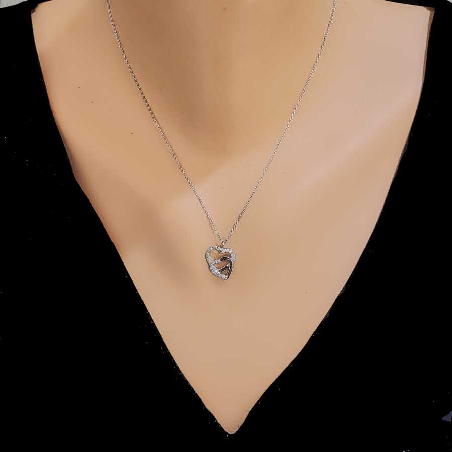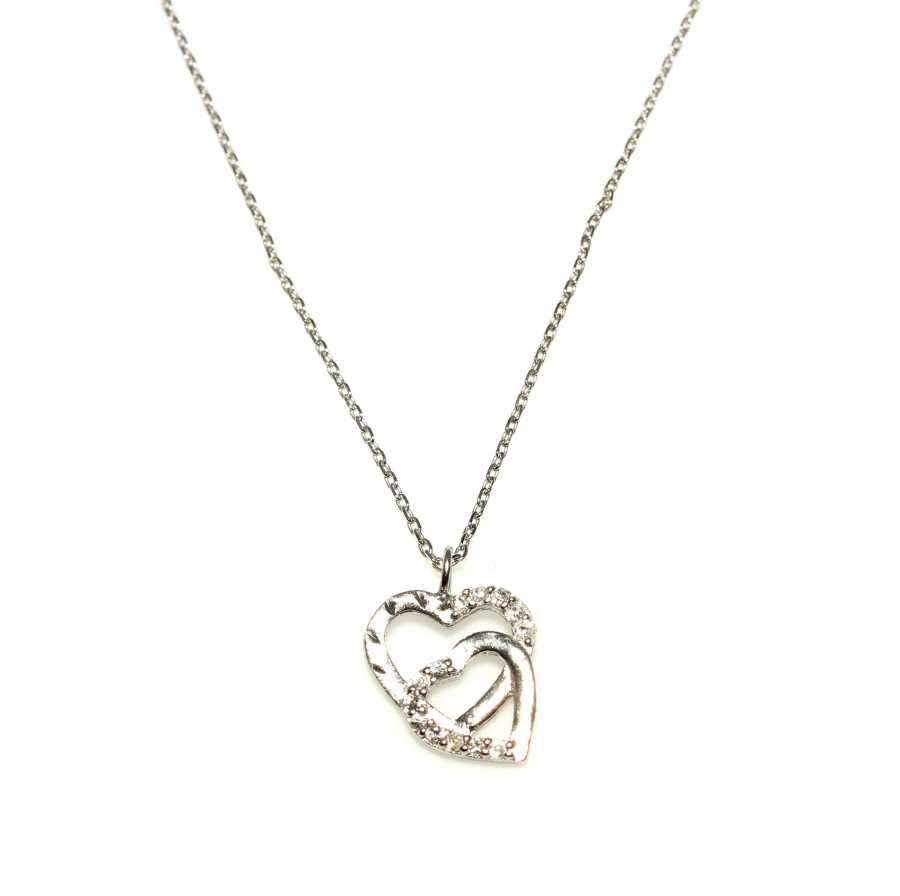 925 Ayar Gümüş Kalemli Çift Kalp Kolye, Beyaz - Beyaz Taş