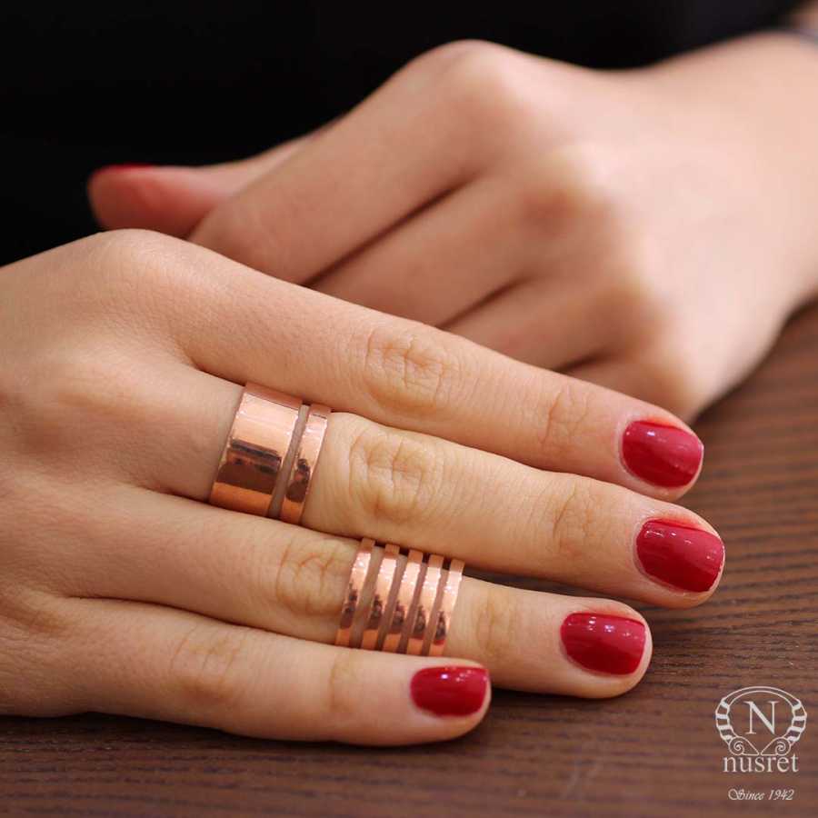 Yüzük 925 ayar gümüşten üretilmiştir. Kalın şerit şeklindeki yüzük ayarlanabilir ölçüdür. Yüzük taşsızdır. Eklem yüzüğü olarak ta kullanabilirsiniz. Rose renk rodaj kaplama yapılmıştır. Ağırlığı 6,15 gramdır.