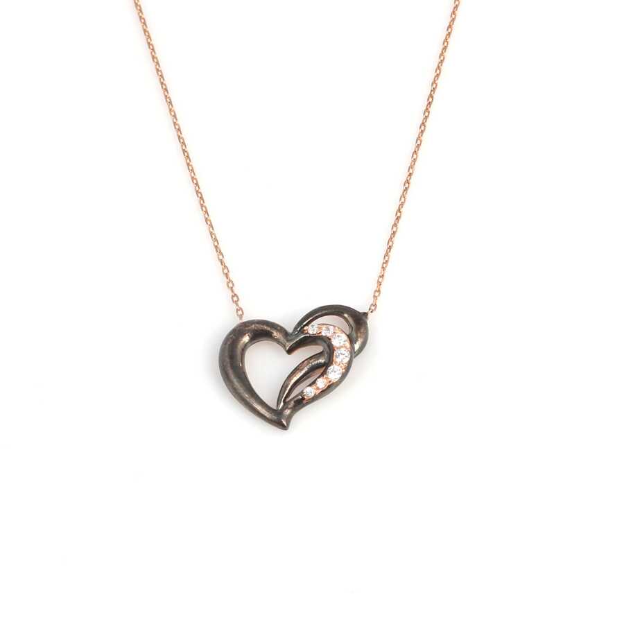 925 Ayar Gümüş Kalp Kolye, Siyah Beyaz - Beyaz Taş