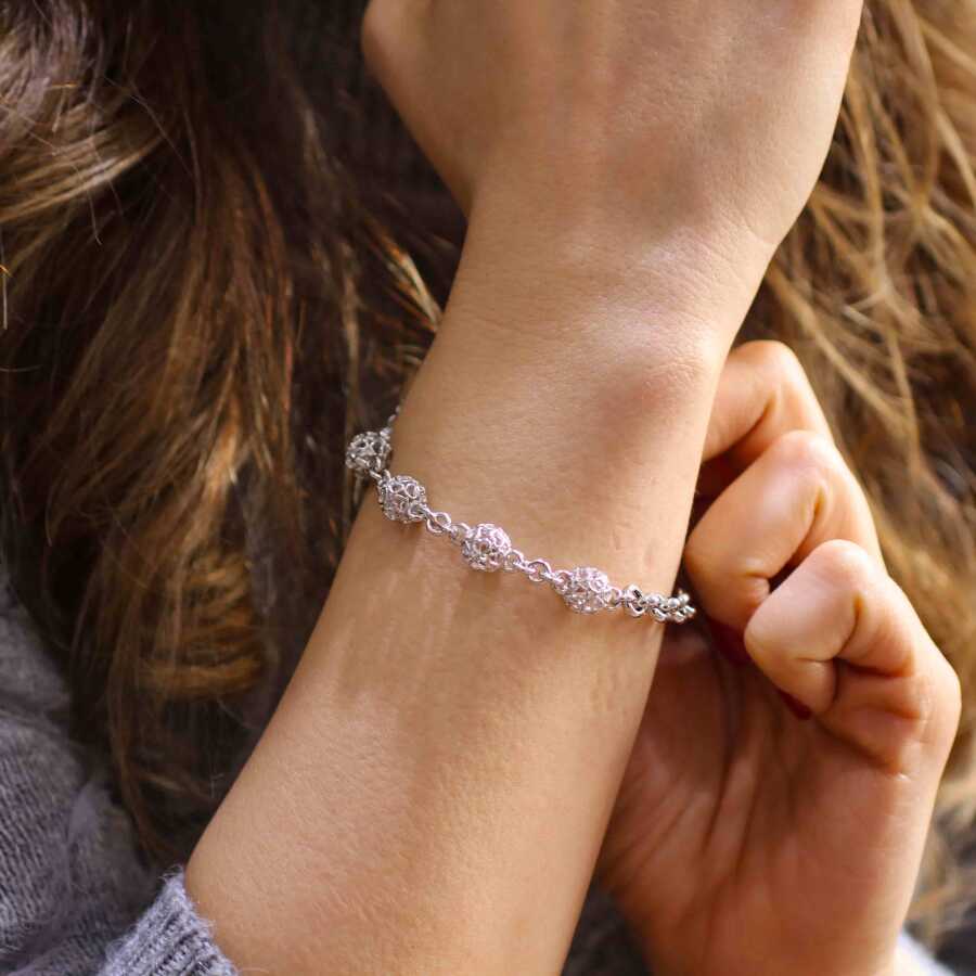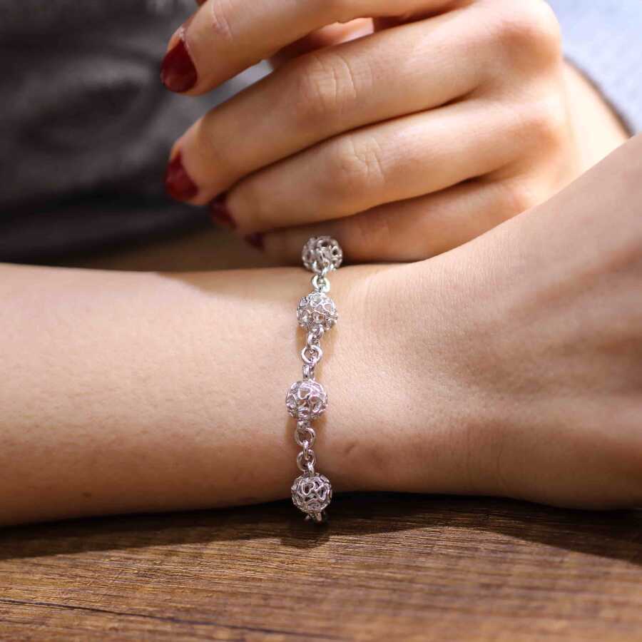 Bileklik 925 ayar gümüşten imal edilmiştir. Kalp şeklindeki toplar ile birleştirilerek tasarlanmıştır. Bileklik 0,9 cm eninden ve 19,5 cm uzunluğundadır. Gümüş bileklik 9,88 gram ağırlığındadır.