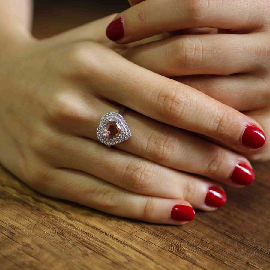 Yüzük 925 ayar gümüşten üretilmiştir. Kalp çift taşlı anturaj model yüzüğün taşı 0,8 cm'ye 0,8 cm boyutlarındadır. Resimdeki yüzük 17 ölçüdür, ancak tüm ölçüler yapılabilmektedir. Yüzük zirkon ve zultanit taşlıdır. Ağırlığı 3,74 gramdır.