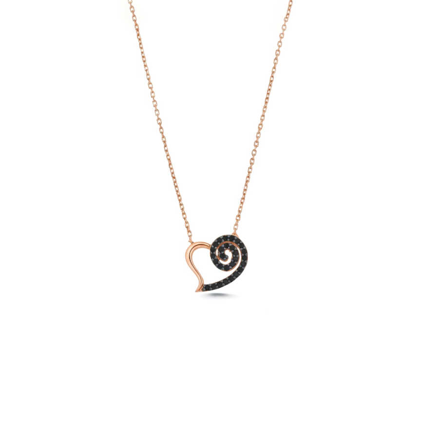 Zarif formu ve derin anlamıyla öne çıkan bu 925 ayar gümüş kolye, siyah taşlarla bezenmiş kalp figürüyle tutkulu, güçlü ve gizemli aşkı simgeler.