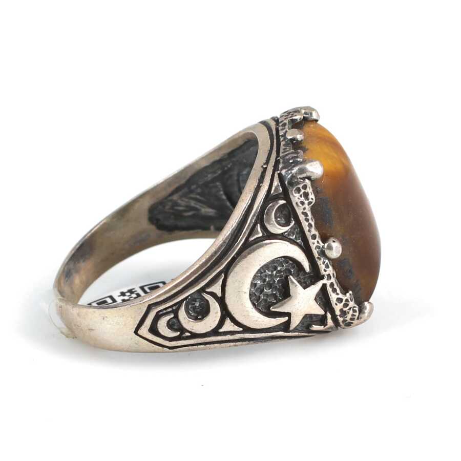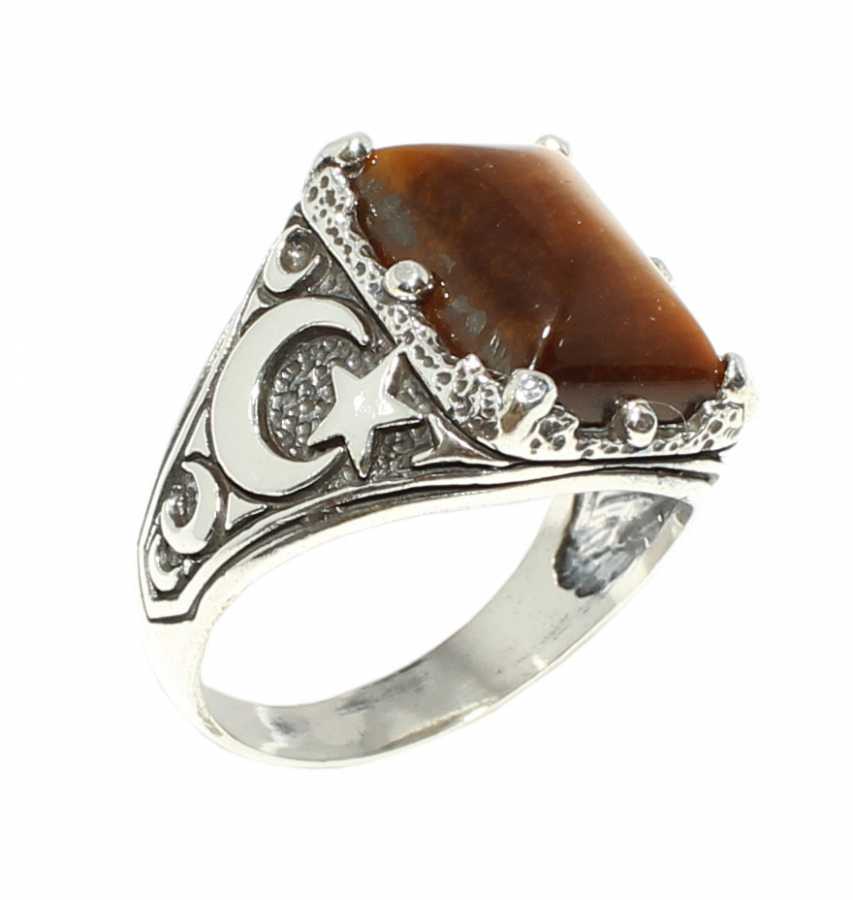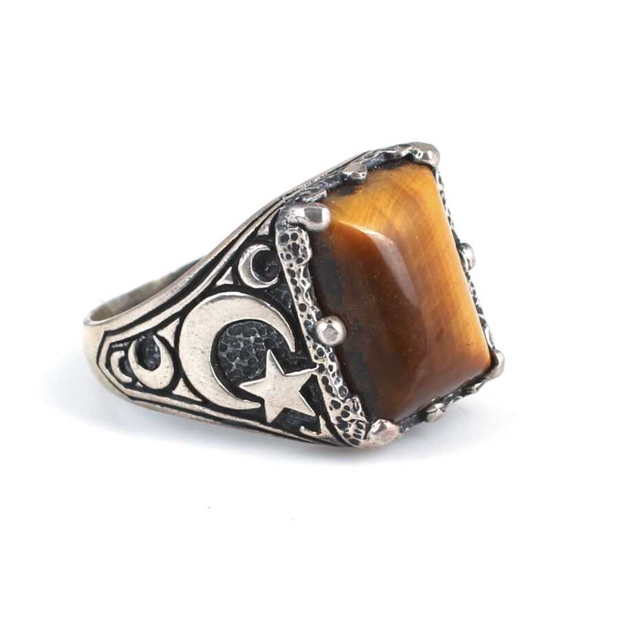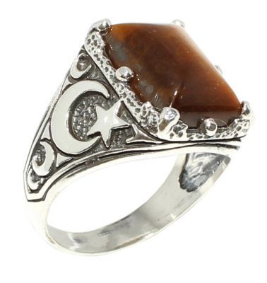 Yüzük 925 ayar gümüşten üretilmiştir. Taşlı yüzük 1,9 cm'ye 1,5 cm boyutlarındadır. Yüzüğün kollarında ay yıldız figürü vardır. Resimdeki yüzük 22 ölçüdür, ancak tüm ölçüler özel olarak yapılabilmektedir. Yüzük kaplan gözü taşlıdır. Ağırlığı 9,19 gramdır.
