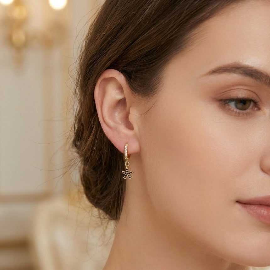 925 ayar gümüştür. 13 x 23 mm ebadında kar taneli taşlı halka küpe. Beyaz, sarı, pembe renkleri mevcuttur. Gramı: 2,76 gr