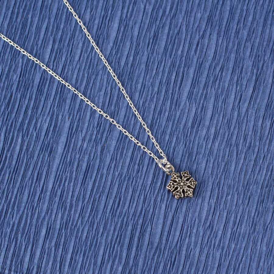 Gümüş kolye 925 ayar gümüşten yapılmıştır. Minik kar tanesi kolye 7 mm'ye 10 mm boyutlarındadır. Zinciri 46 cm uzunluğundadır. Kolye taşsızdır. Ağırlığı 1,9 gramdır.