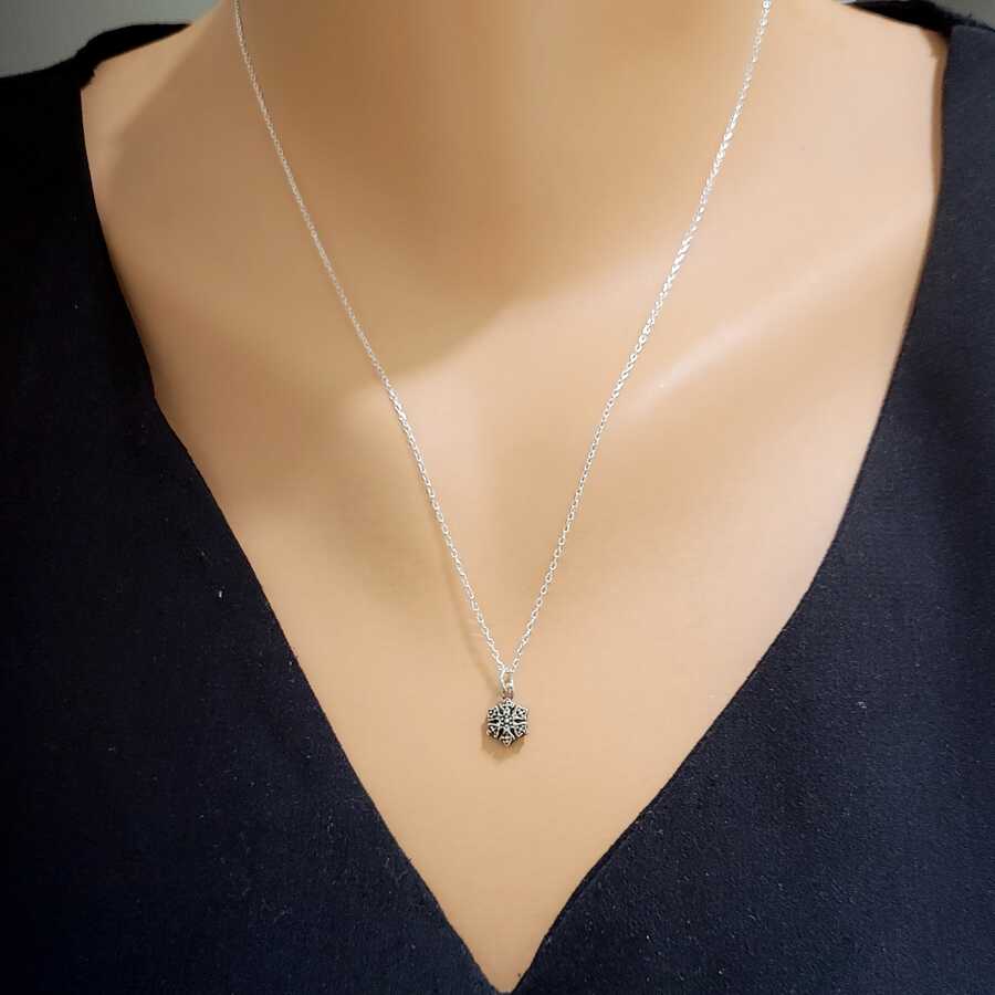 Gümüş kolye 925 ayar gümüşten yapılmıştır. Minik kar tanesi kolye 0,7 cm'ye 1 cm boyutlarındadır. Zinciri 46 cm uzunluğundadır. Kolye taşsızdır. Ağırlığı 1,9 gramdır.