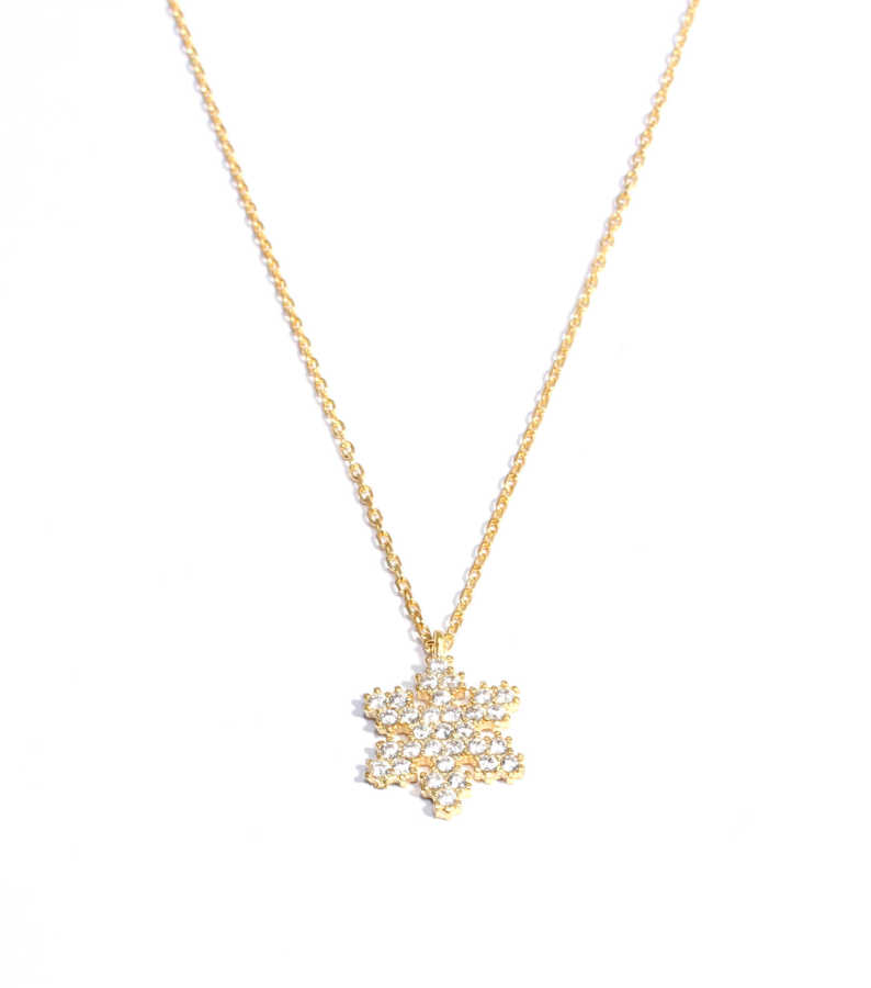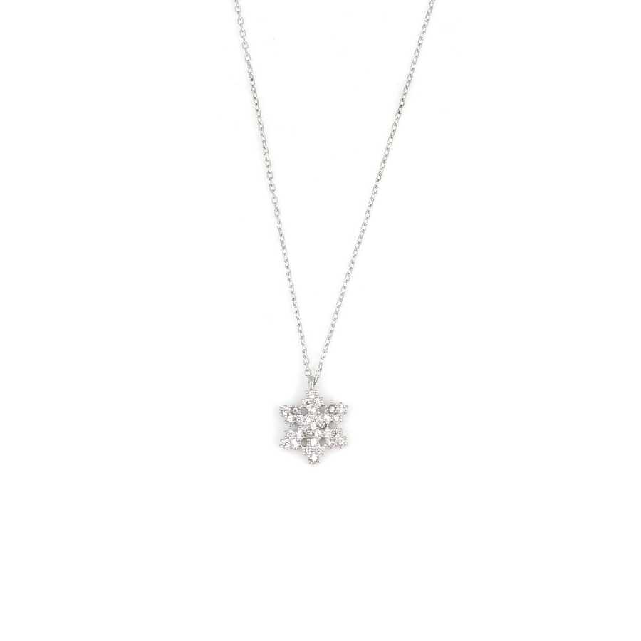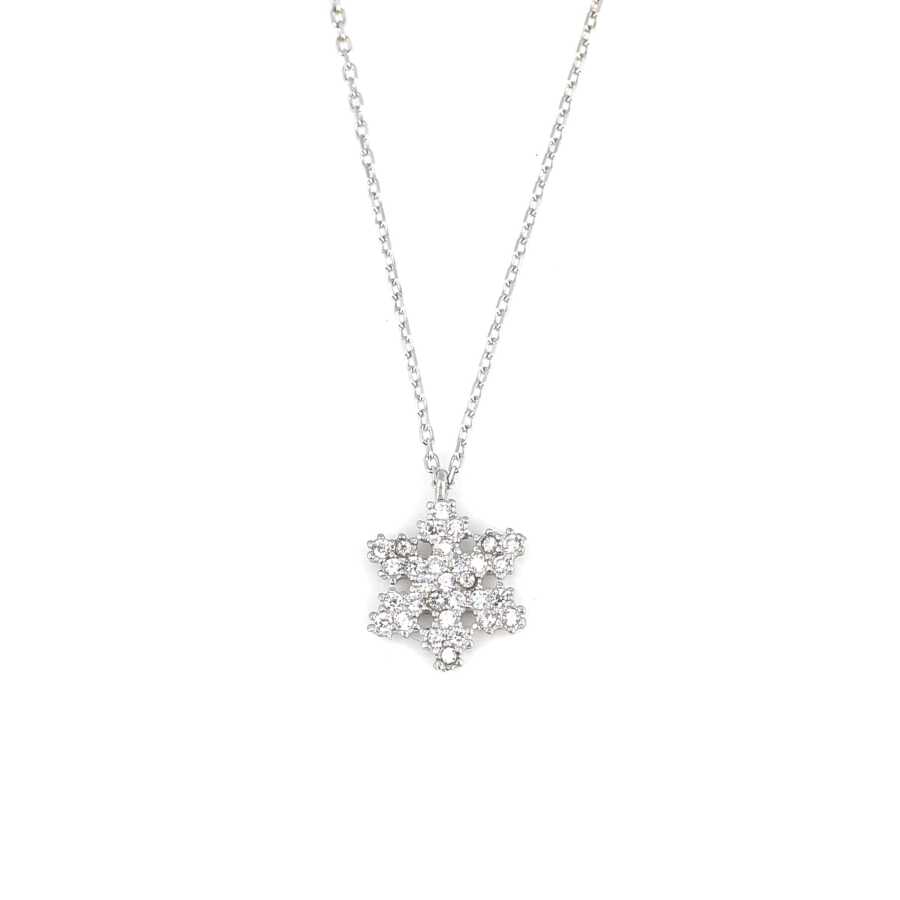 The necklace is crafted from 925 sterling silver and features a 1,2 cm snowflake pendant adorned with zircon stones, paired with a 45 cm chain and weighing approximately 2.13 grams.