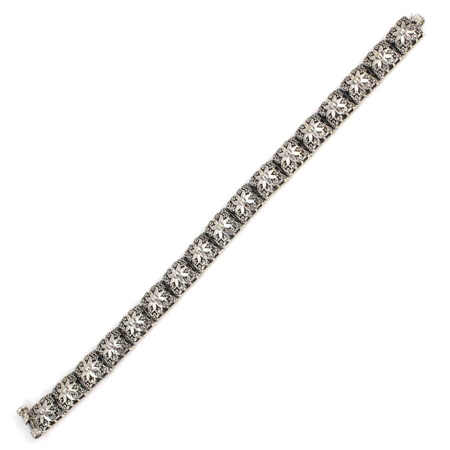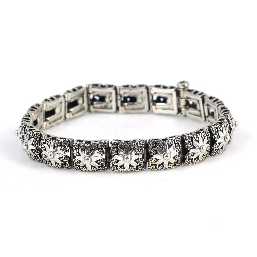 Bileklik 925 ayar gümüşten imal edilmiştir. Kare papatya desenli bileklik 1 cm eninde ve 18 cm uzunluğundadır. Gümüş desenli bileklik taşsızdır. Gümüş bileklik 38,5 gramdır.