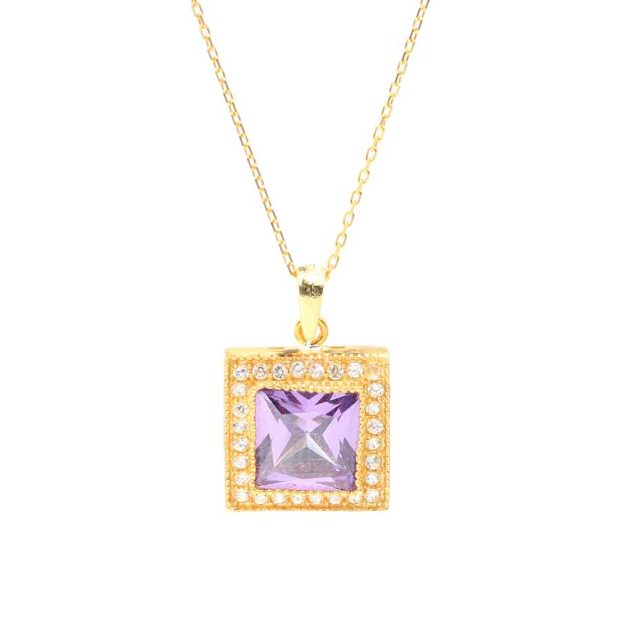925 Ayar Gümüş Kare Sentetik Ametist Taşlı Kolye