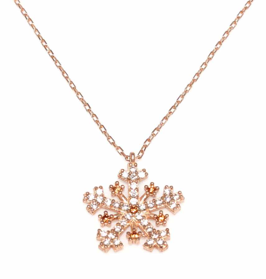 Gümüş kolye 925 ayar gümüşten yapılmıştır. Kar tanesi şeklindeki kolye tepelik dahil 1,8 cm'ye 1,6 cm boyutlarındadır. Zinciri 45 cm uzunluğundadır ve taşları beyaz ve turuncu zirkondur. Ağırlığı 2,22 gramdır.