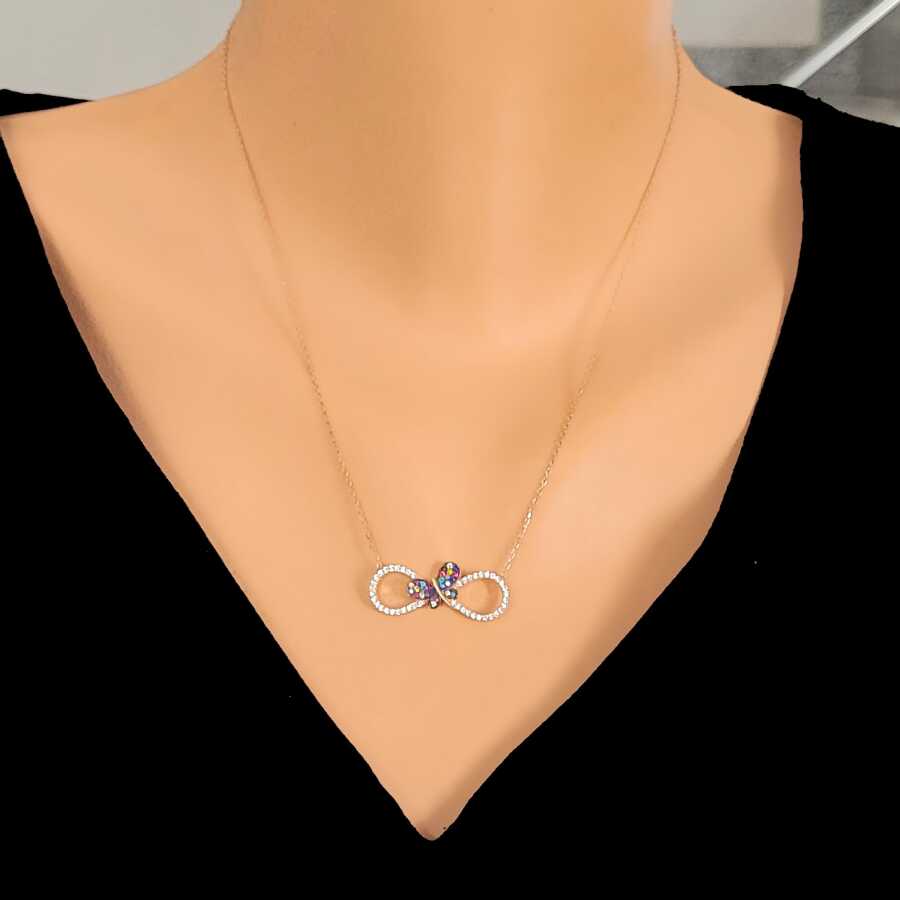 Gümüş kolye 925 ayar gümüşten yapılmıştır. Kelebekli sonsuzluk şeklindeki kolye 1,2 cm'ye 2,9 cm boyutlarındadır. Zinciri 45 cm uzunluğundadır. Kolyenin taşları zirkondur. Rose renk rodajlıdır. Ağırlığı 2,6 gramdır.