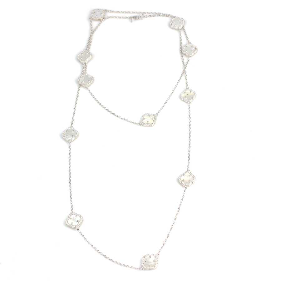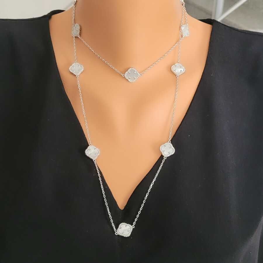 Gümüş kolye 925 ayar gümüşten yapılmıştır Yonca model kolye 97 cm uzunluğundadır Kolye üzerinde 11 adet yonca figürü mevcuttur Yonca figürü 1,0 cm boyutunda zirkon ve sedef taşlıdır . Ağırlığı 22,46 gramdır.