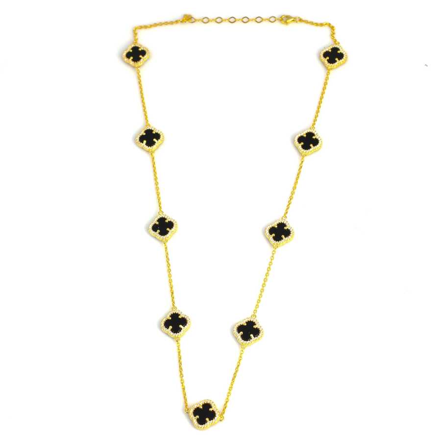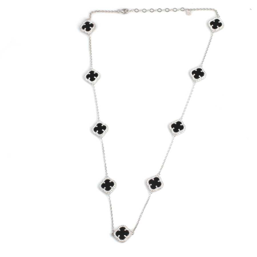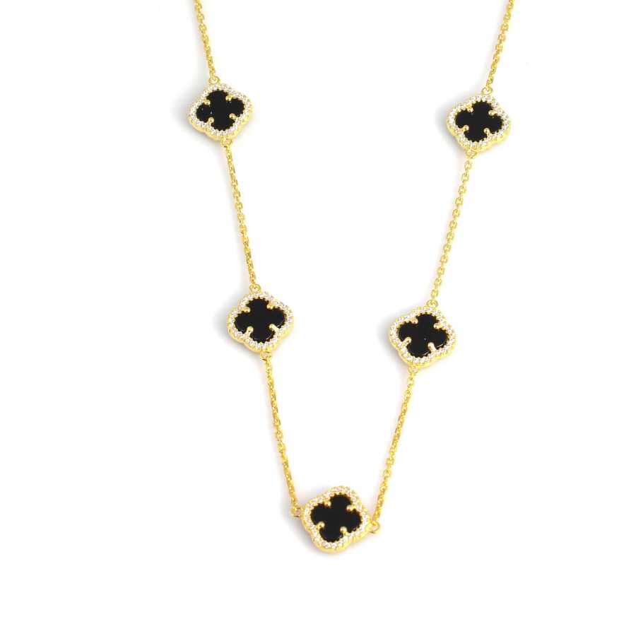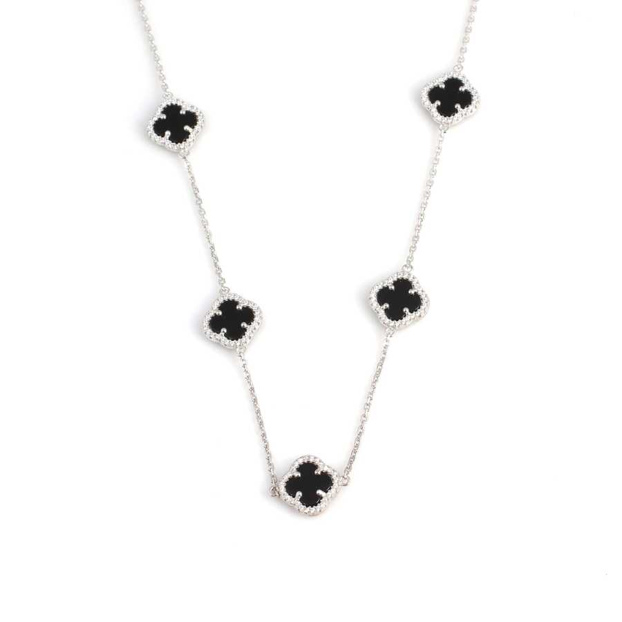 925 Ayar Gümüş Kenarları Zirkon Taşlı Yonca Model Oniks Taşlı Kolye