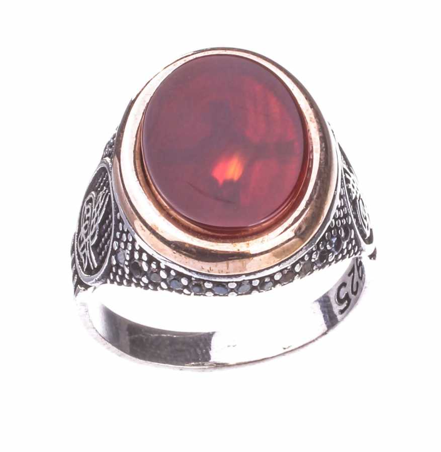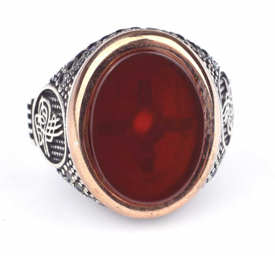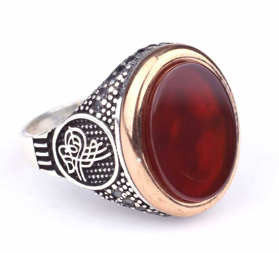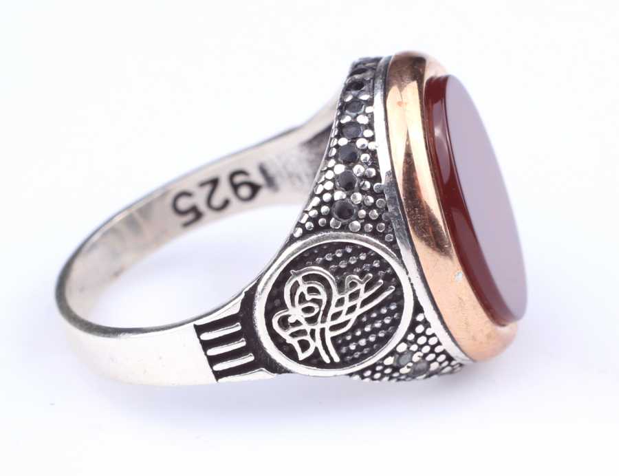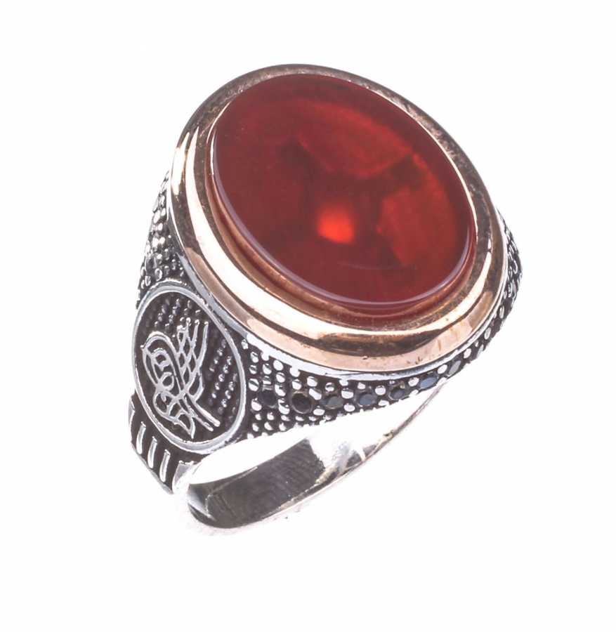 925 Ayar Gümüş Kırmızı Akik Taşlı Tuğra Desenli Erkek Yüzük