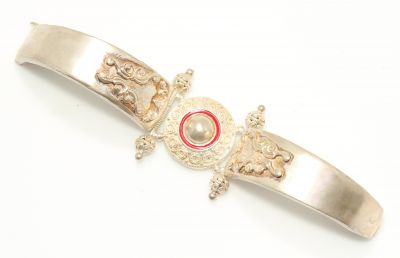 Bileklik 925 ayar gümüşten imal edilmiştir. Paftalı fantezi bileklik 6 cm çapındadır. Bileklik taşsız ve kırmızı minelidir. Gümüş bileklik 52,65 gram ağırlığındadır.