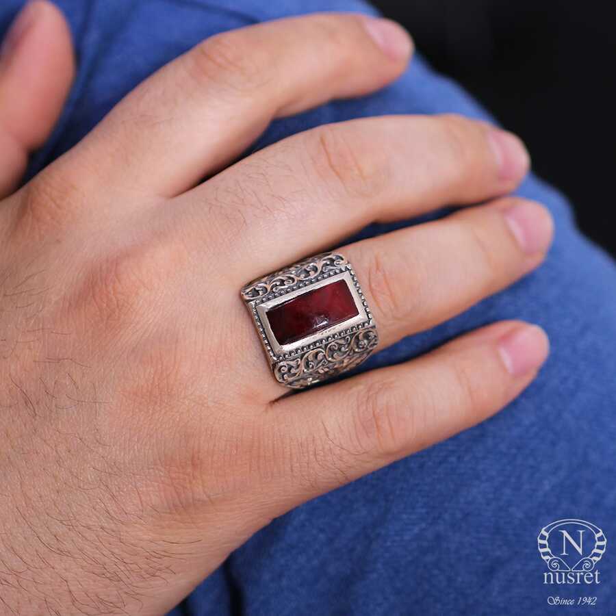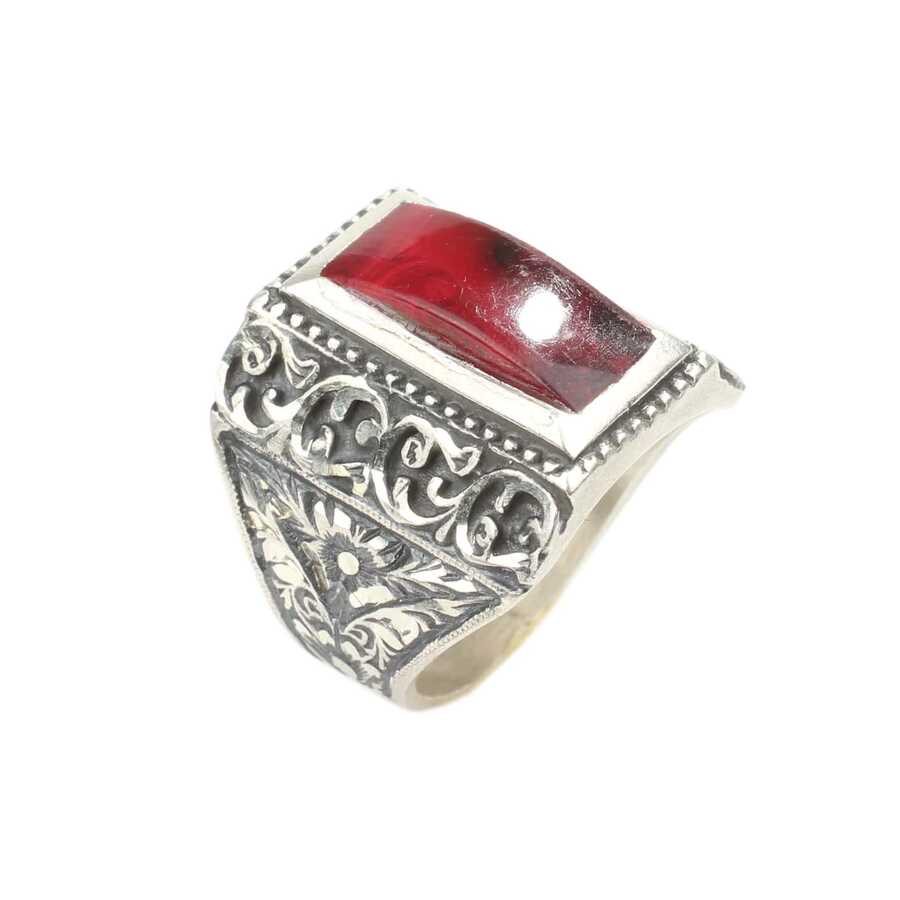 Yüzük 925 ayar gümüşten üretilmiştir. Yüzüğün üzerinde el kalemi atılarak tasarlanmıştır. Taşlı yüzük 2 cm'ye 1 cm boyutlarındadır. Resimdeki yüzük 25 ölçüdür, ancak tüm ölçüler özel olarak yapılabilmektedir. Yüzük sıkma kehribar taşlıdır. Ağırlığı 15,48 gramdır.