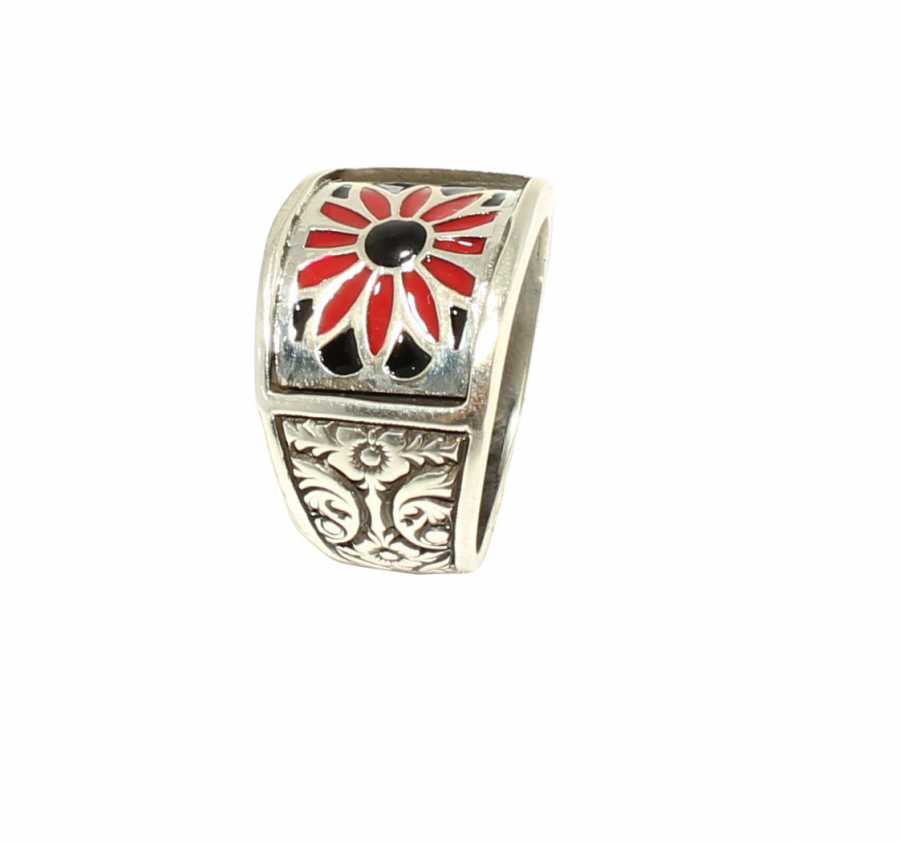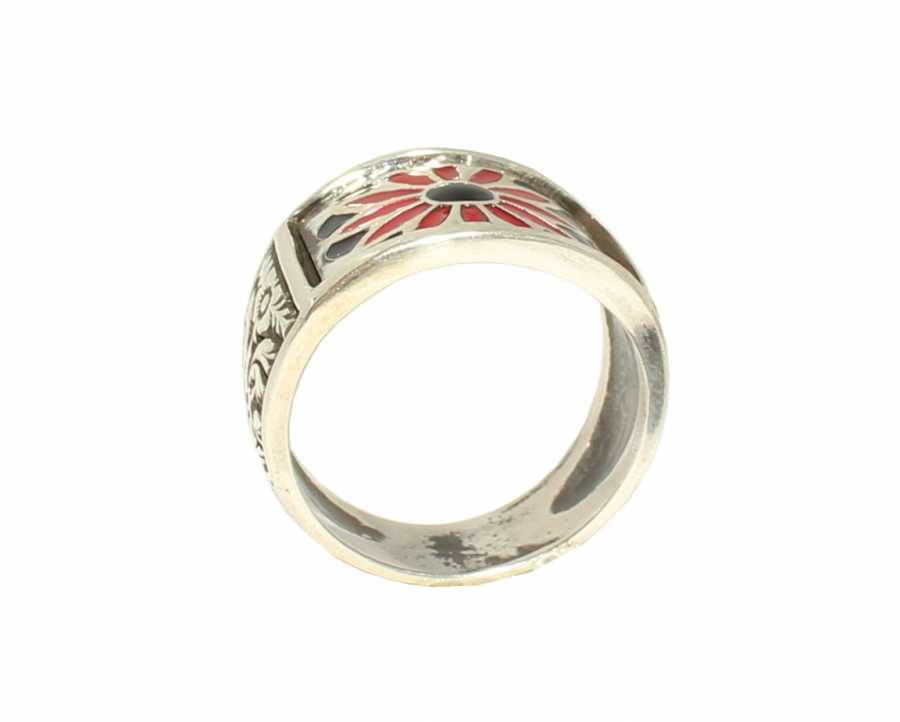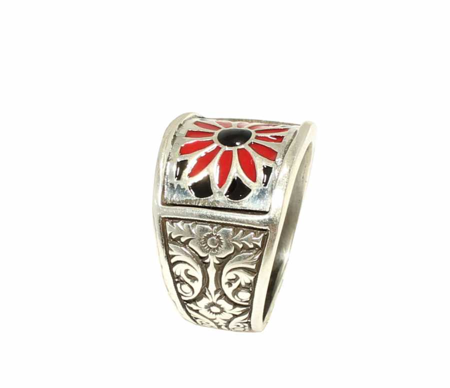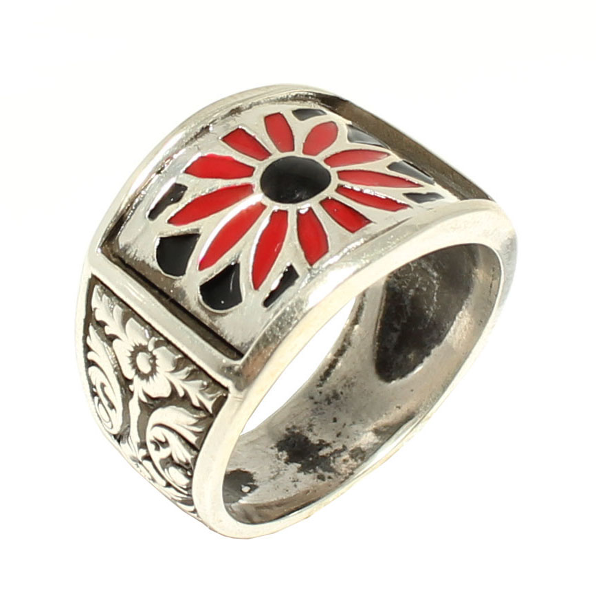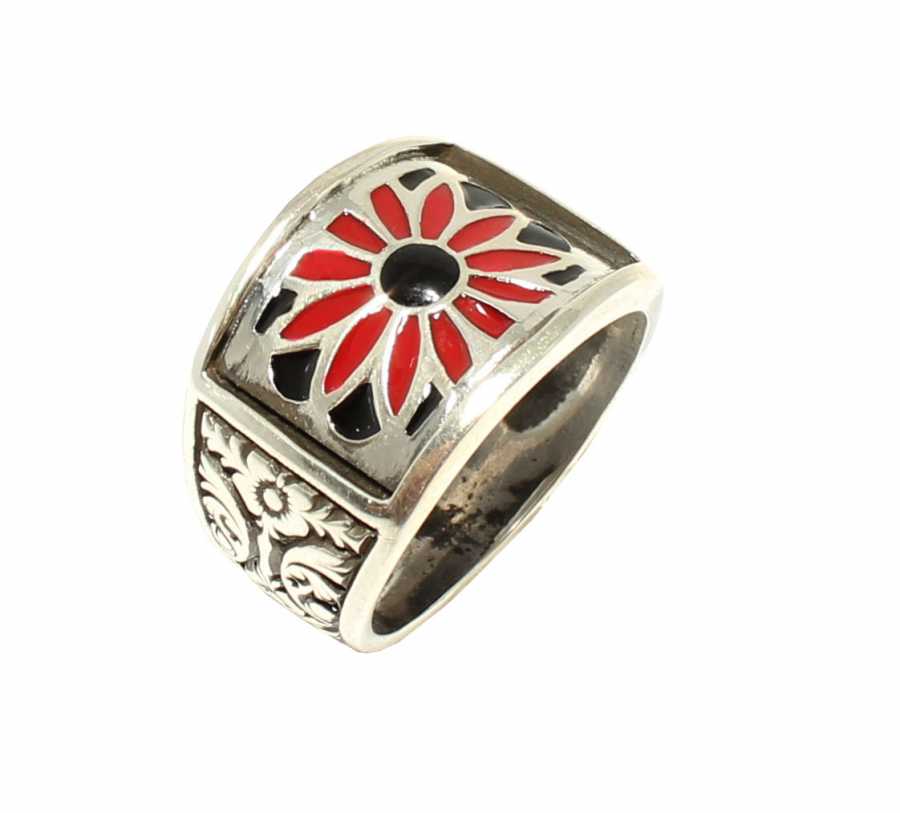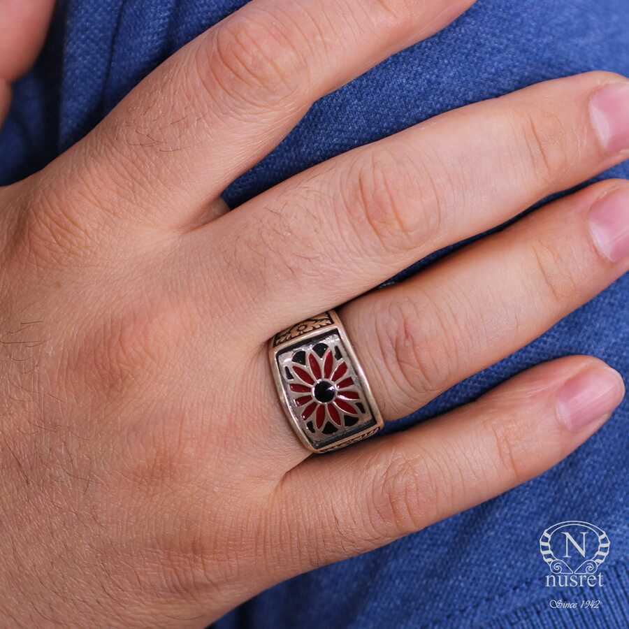 Yüzük 925 ayar gümüşten üretilmiştir. Gümüş yüzüğün üst kısmı kırmızı ve siyah renk mine yapılmıştır. Yüzüğün üst kısmı 1,5 cm'ye 2,0 cm boyutlarındadır. Resimdeki yüzük 21 ölçüdür, ancak tüm ölçüler yapılabilmektedir. Yüzük taşsızdır. Ağırlığı 10,07 gramdır.