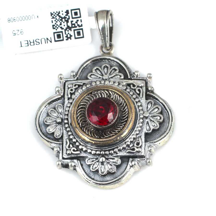 Kolye ucu 925 ayar gümüş ve bronzdan imal edilmiştir. Dörtgen şeklindeki konstantin kolye ucu 3,3 cm'ye 4,6 cm boyutlarındadır. Zincir dahil değildir. Kolye ucu kırmızı renk zirkon taşlıdır. Gümüş kolye ucu 13,15 gramdır.