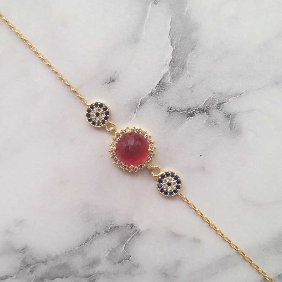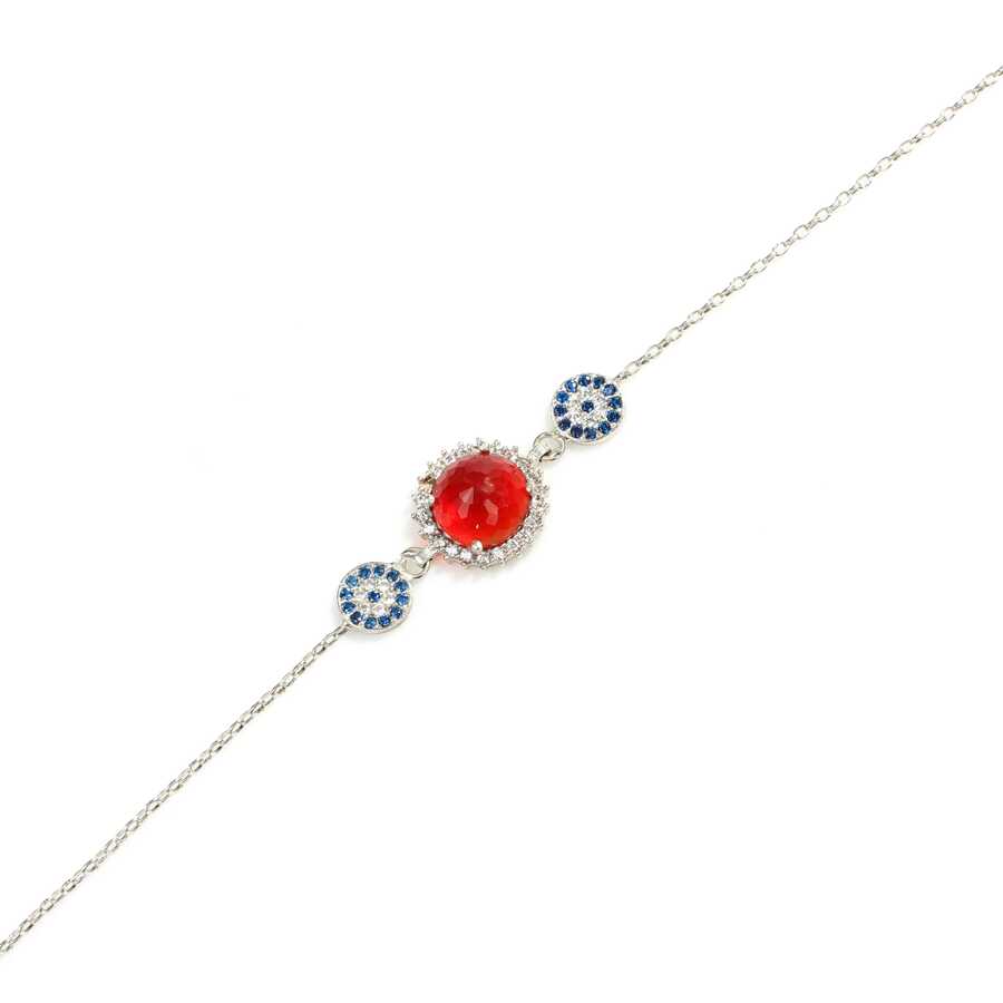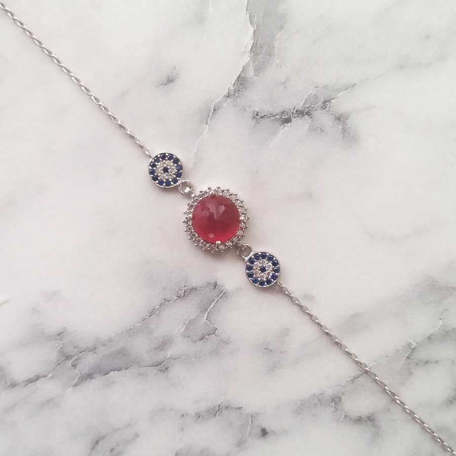 925 ayar gümüştür. Bileklik 18,5 cm boyunda uzatma zinciri ile birlikte 21 cm'dir. Bilekliğin orta parçası kırmız taşının kenarında beyaz zirkon taşlar vardır. Boyutu: 1,4 cm'dir yanında nazar bocukları vardır. Boyutu: 0,8 cm'dir. Sarı ve beyaz renktedir. Ağırlığı 3,61 gramdır.