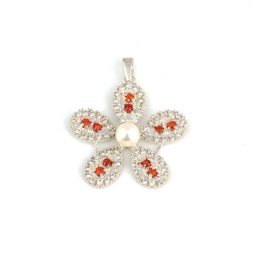 925 Ayar Gümüştür. 36 x 29 mm ebadında papatya şeklinde inci ve kırmızı zirkon taşlı kolye ucu. Gramı: 4,37