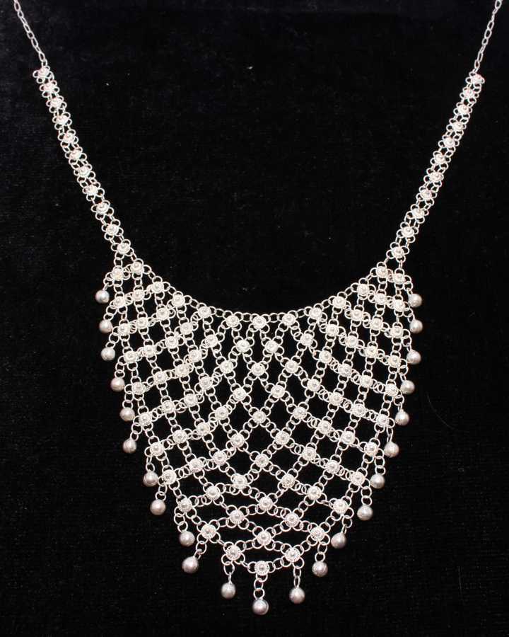 925 ayar gümüş 46 cm boyunda elişi güverseli parçaların birbirine monte edilerek muska şeklinde dizilmesi ile oluşan kolyenizin kenarlarında küçük toplarla süslenmiştir. Ayrıca değişik şekillerde örülebilmektedir. Ağırlığı 39,9 gramdır.