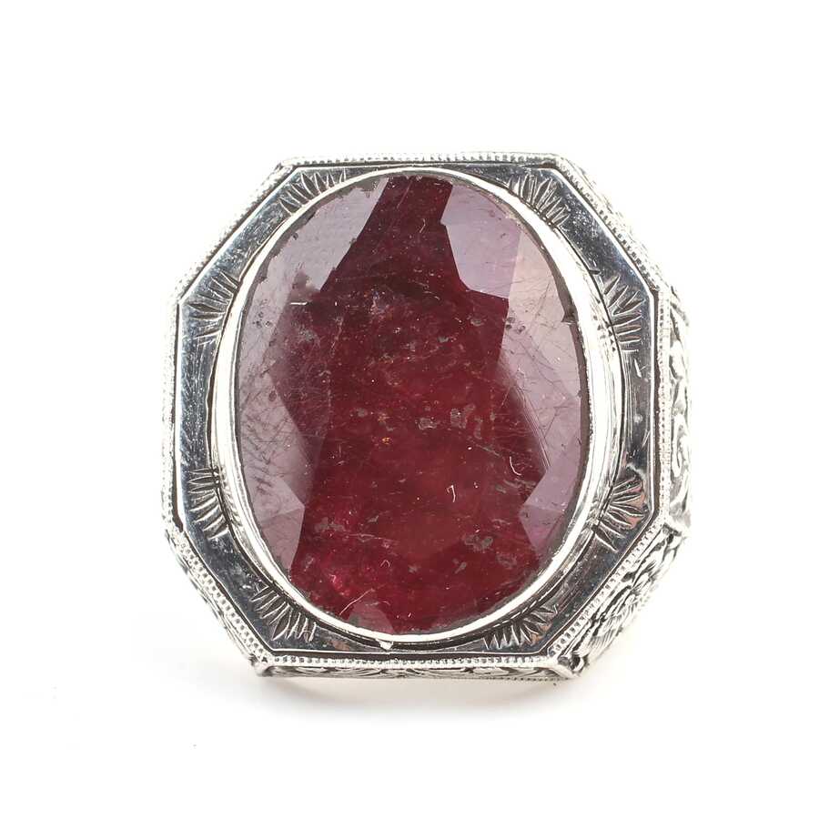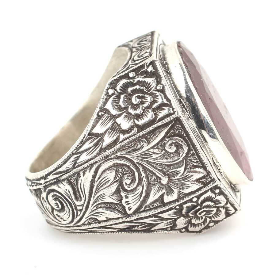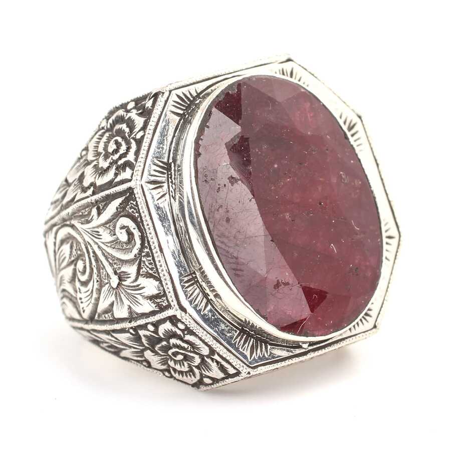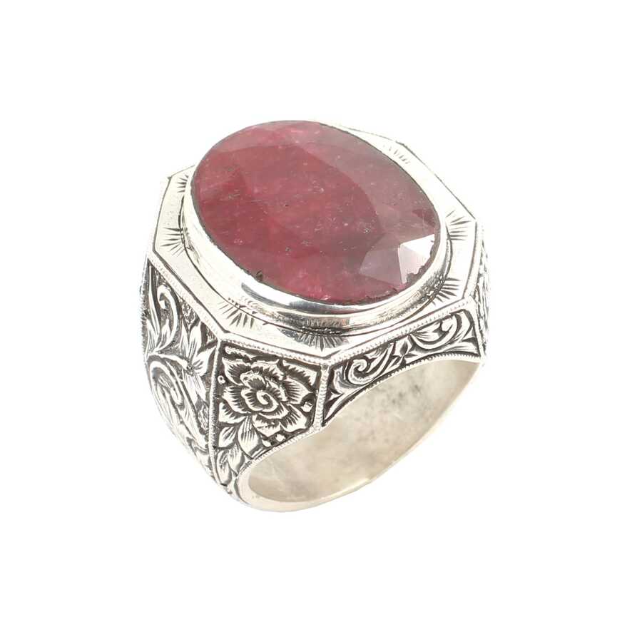 Yüzük 925 ayar gümüşten üretilmiştir. Yüzüğün üzerinde el kalemi atılarak tasarlanmıştır. Taşlı yüzük 2,4 cm'ye 1,8 cm boyutlarındadır. Resimdeki yüzük 24 ölçüdür, ancak tüm ölçüler özel olarak yapılabilmektedir. Yüzük kök yakut renk taşlıdır. Ağırlığı 34,66 gramdır.