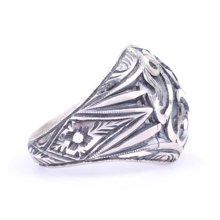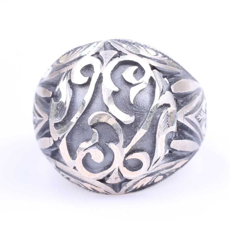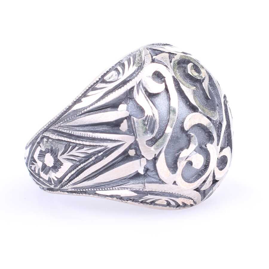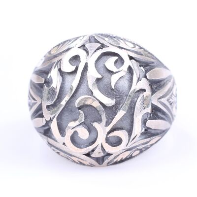 Yüzük 925 ayar gümüşten üretilmiştir. Yüzüğün üzerinde el kalemi atılarak tasarlanmıştır. Taşsız yüzüğün üzeri bombelidir. Resimdeki yüzük 25 ölçüdür, ancak tüm ölçüler özel olarak yapılabilmektedir. Yüzük taşsızdır. Ağırlığı 14,05 gramdır.