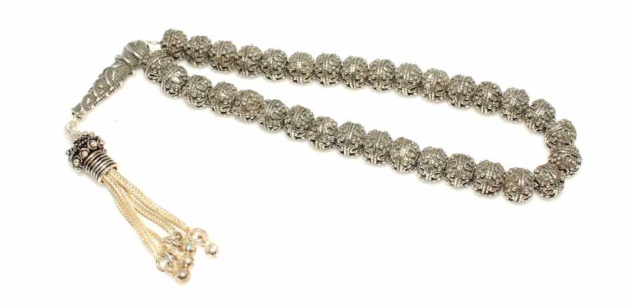 Küre kesim gümüş tesbih topu 0,7 cm boyutlarındadır. Gümüş tespih toplam uzunluğu 17 cm'dir. Gümüş imamesi yılan derisi desenlidir. Tespihin ağırlığı 37,12 gramdır.