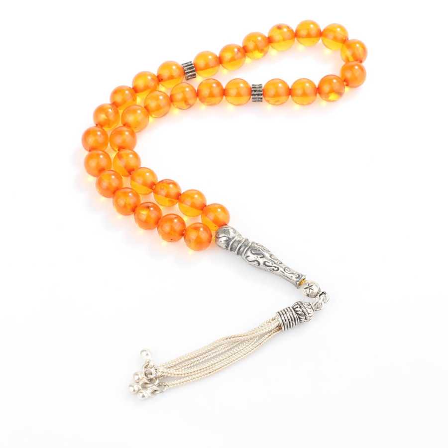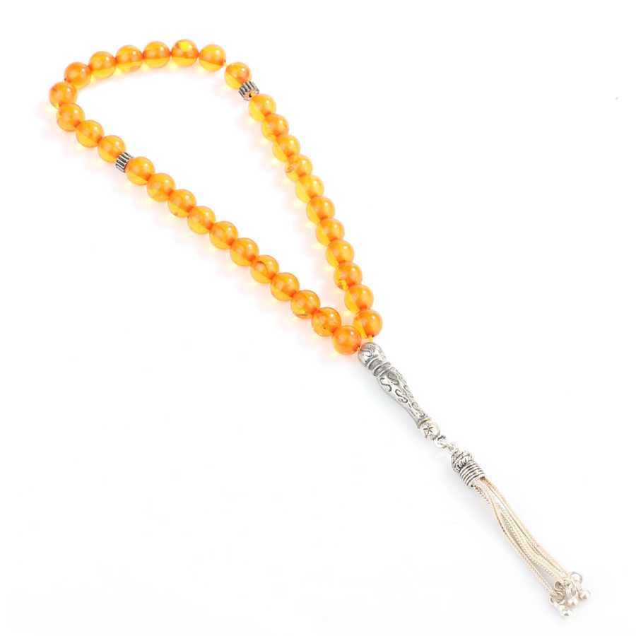 925 Ayar Gümüş Küre Kesim Turuncu Renk Sıkma Kehribar Tesbih