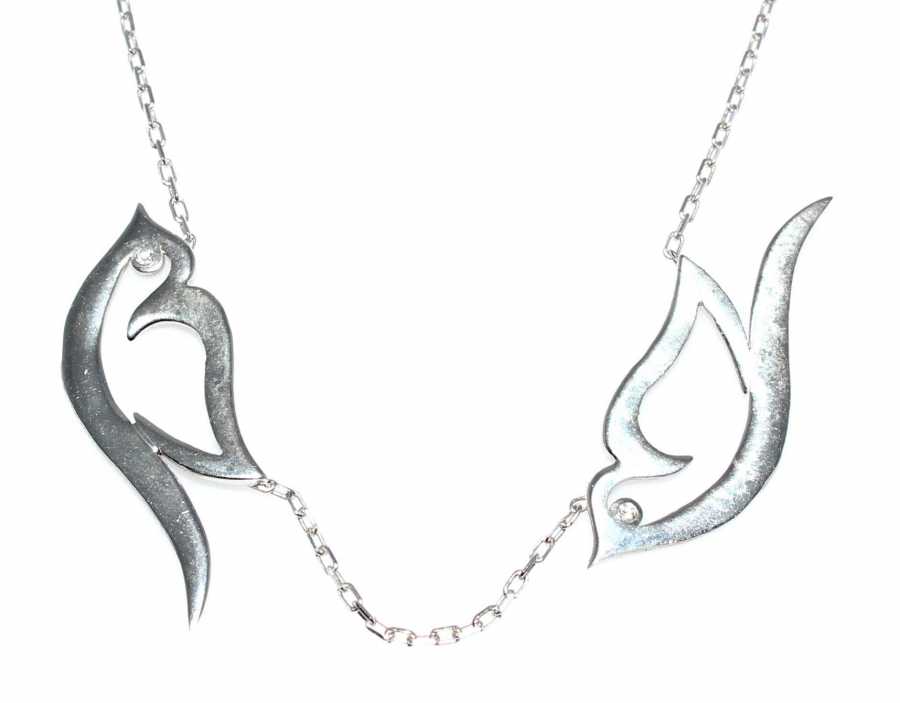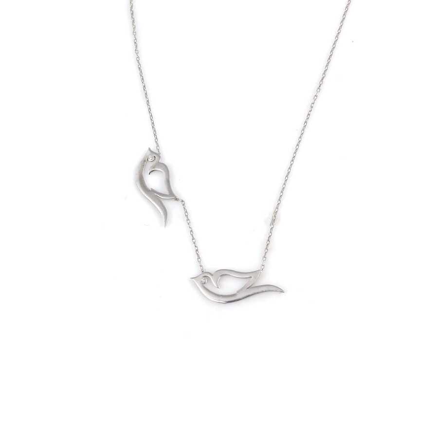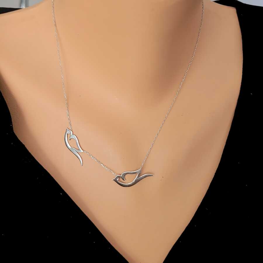 Gümüş kolye 925 ayar gümüşten yapılmıştır. 2 adet kuş figüründen oluşan ince gerdanlık kolye 45 cm uzunluğundadır. Kolye ucundaki kuş 2,5 cm'ye 0,9 cm boyutlarındadır. Kolye taşsızdır. Ağırlığı 2,1 gramdır.