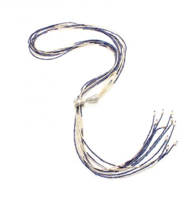 Gümüş kolye 925 ayar gümüşten yapılmıştır. La pis taşların aralarına şarnel borular eklenerek 10 sıra dizilmiş kolye 75 cm uzunluğundadır. Kolye la pis taşlıdır. Ağırlığı 63,62 gramdır.