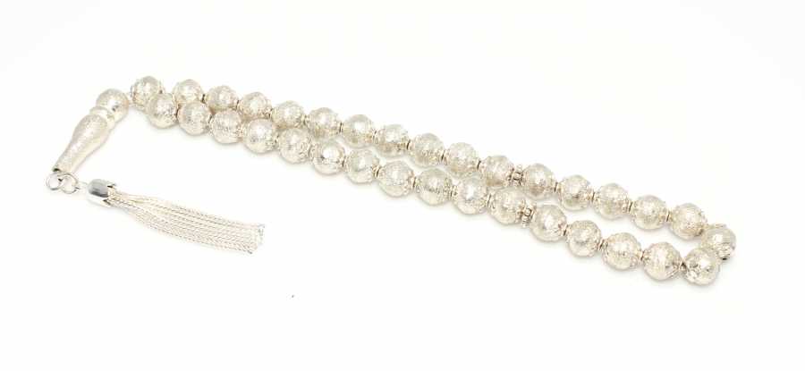 925 Ayar Gümüş Lazer Desenli Top Tesbih ve İmame, Beyaz