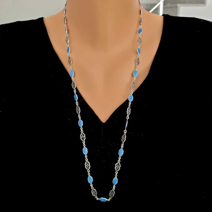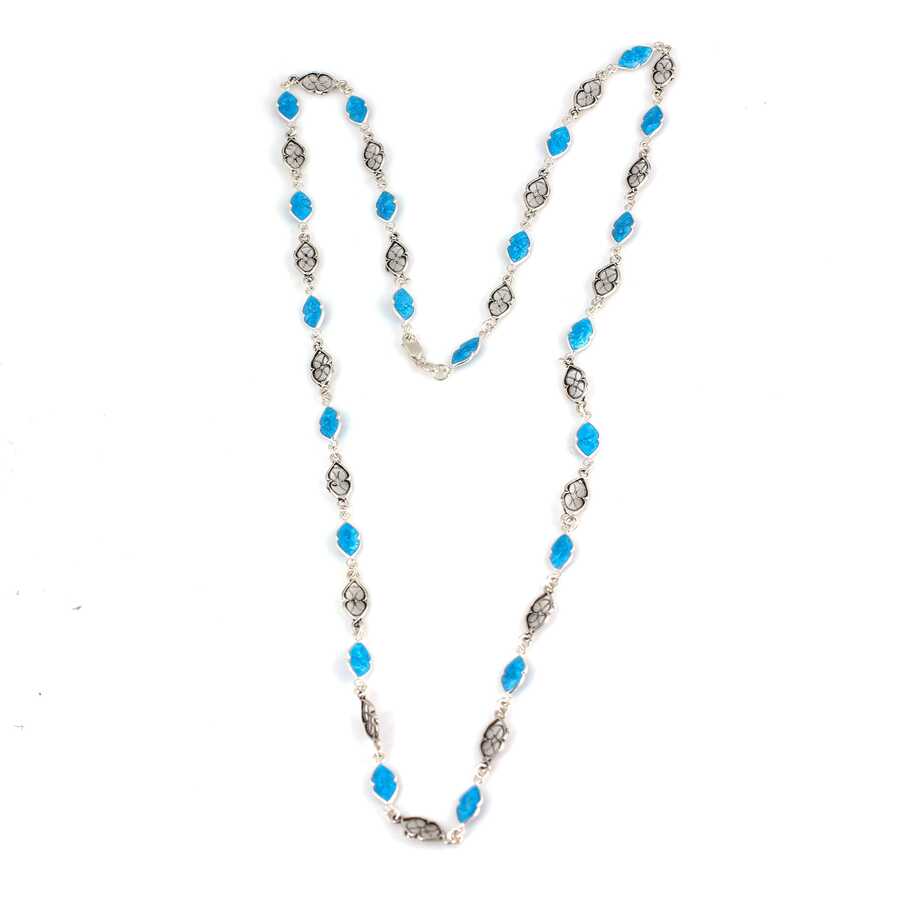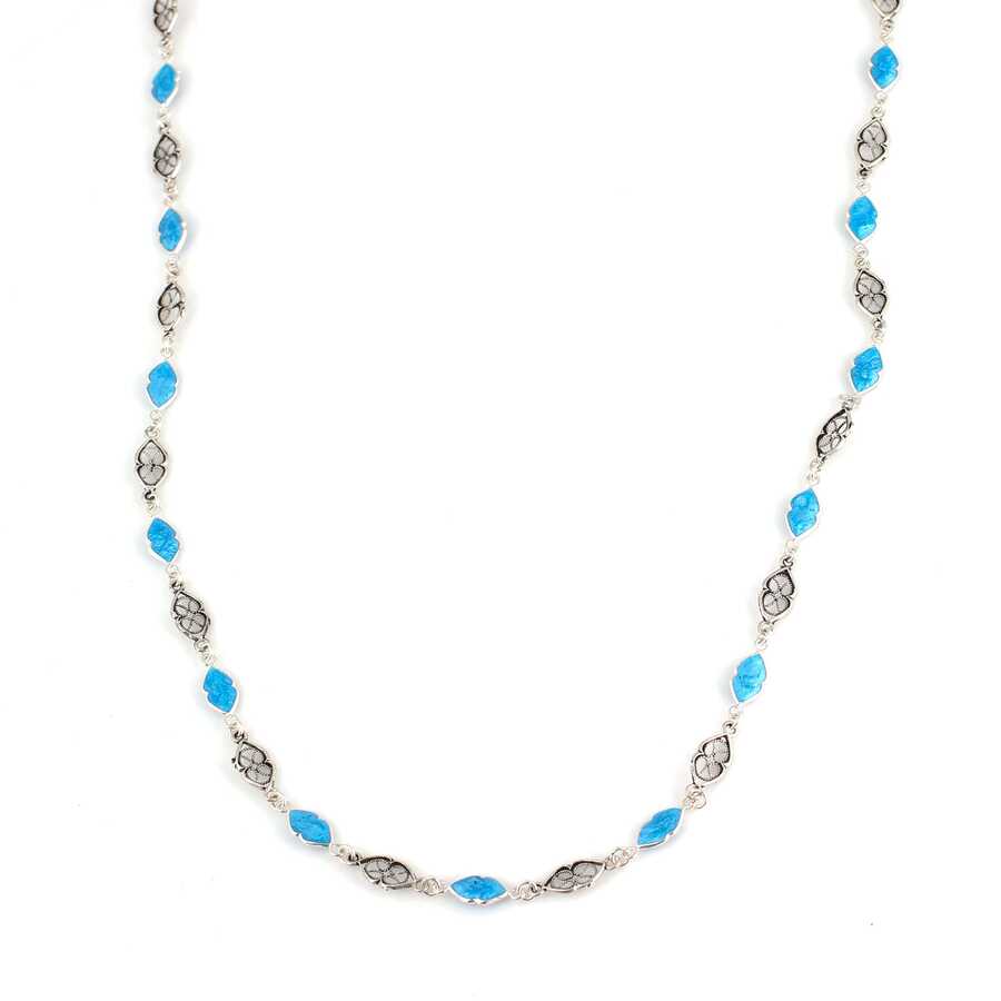Gümüş kolye 925 ayar gümüşten yapılmıştır. Telkari kolye 65 cm uzunluğundadır. Telkari parça 0,6 cm'ye 1,6 cm boyutlarındadır. Kolye mavi sedef minelidir. Ağırlığı 13,61 gramdır.