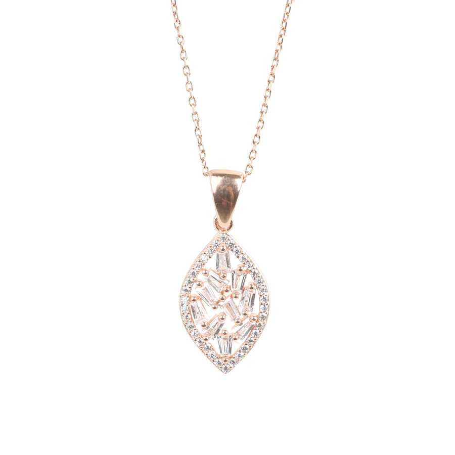 Gümüş kolye 925 ayar gümüşten yapılmıştır. Mekik şeklinde ve içinde minik baget taşlar eklenen kolye 1,9 cm'ye 1,7 cm boyutlarındadır. Gümüş kolye 45 cm uzunluğundadır. Kolye beyaz zirkon taşlıdır. Ağırlığı 2,96 gramdır.
