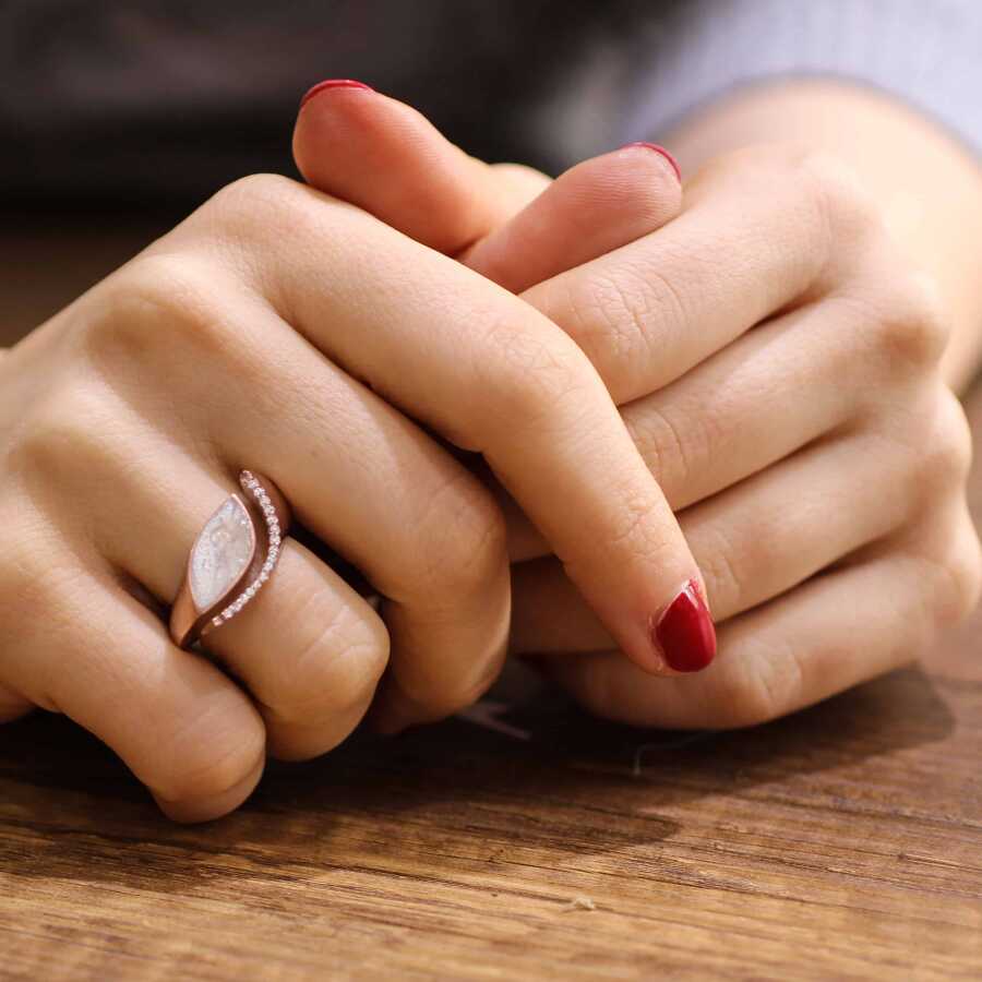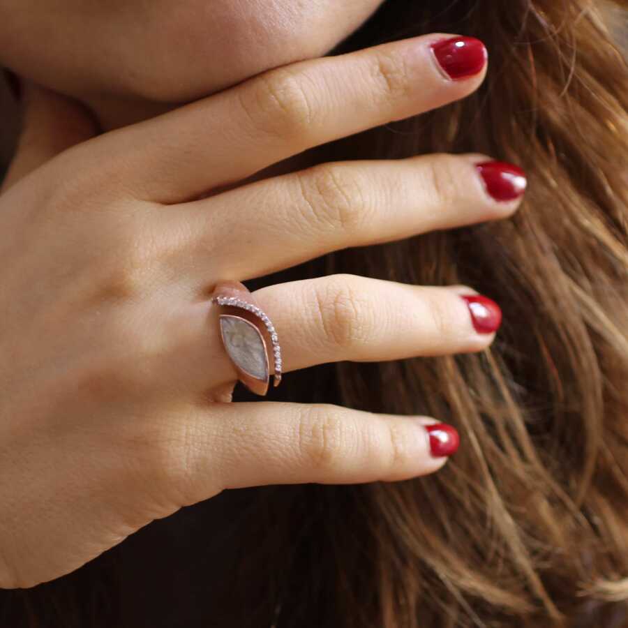 Yüzük 925 ayar gümüşten üretilmiştir. Mekik şeklinde yüzük 2,3 cm'ye 1,1 cm boyutlarındadır. Resimdeki yüzük 15 ölçüdür, ancak tüm ölçüler yapılabilmektedir. Yüzük sedef taşlıdır. Ağırlığı 7,01 gramdır.